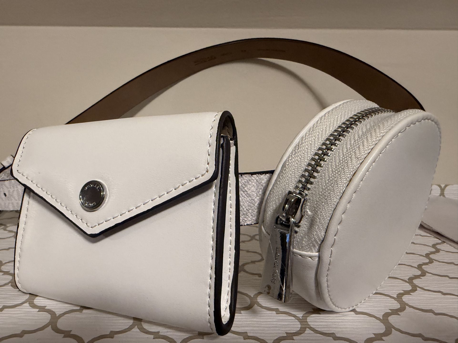 Brand new, never used Michael Kors white belt bag made of genuine leather. Features two separate pouches for easy organization — one envelope-style flap pouch with snap closure and one round zip pouch with silver-tone hardware. Adjustable brown belt strap for a comfortable fit. Perfect for travel, festivals, shopping, or everyday wear. Clean, stylish, and practical design. Pickup only!