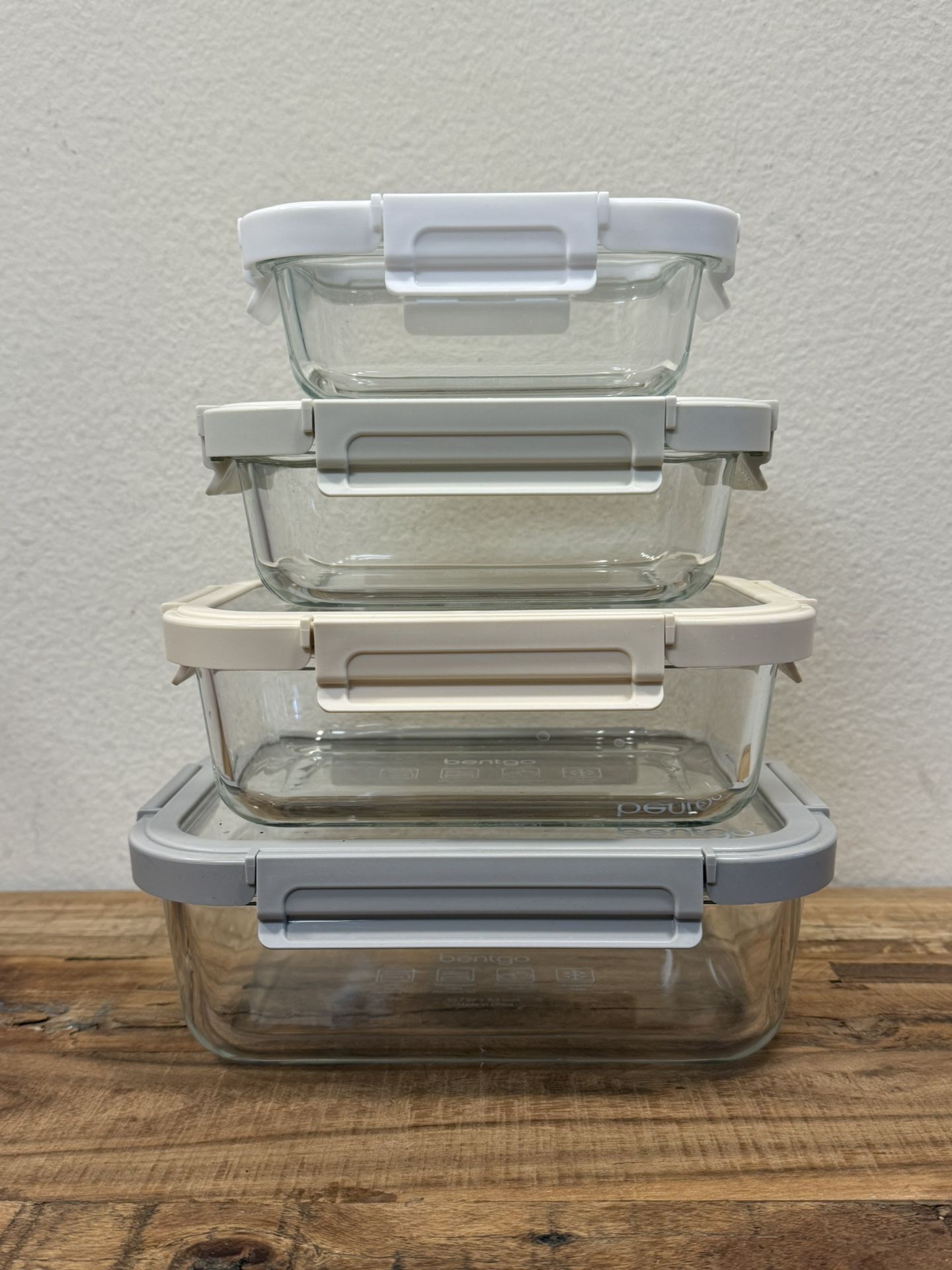 Set of 4 includes: 1.6 cups 2.7 cups 4.4 cups 6.3 cups Nests together for compact storage and has an air tight seal to prevent leaks. Oven, microwave, freezer, and dishwasher safe. Small chip on the bottom edge of 4.4 cup container that doesn’t affect usage and isn’t sharp!