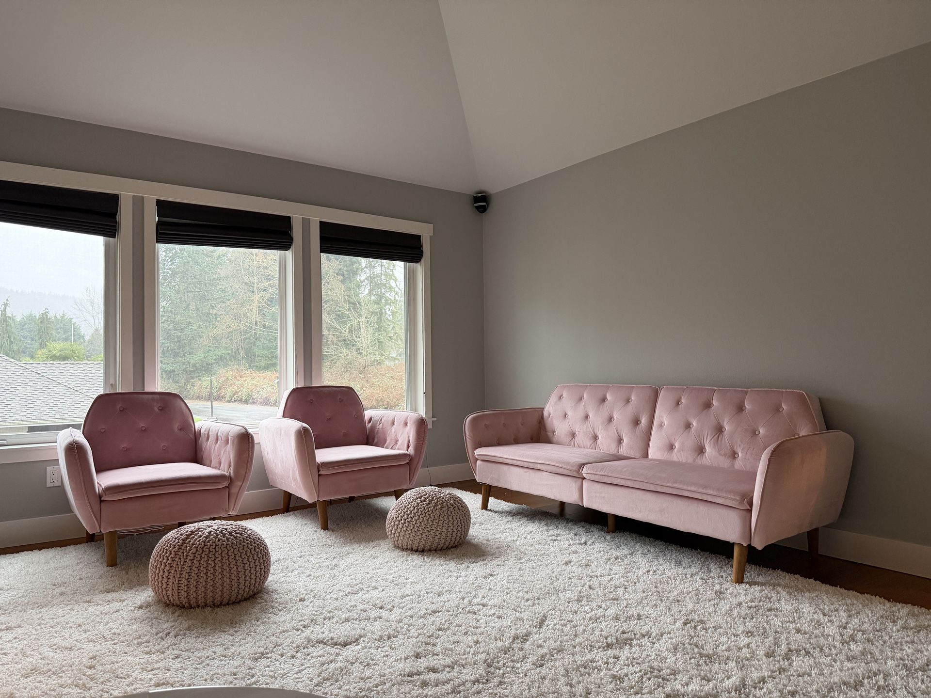 This set was purchased on Amazon in 2019 for $831.00. (Receipt in photos). Comes from a clean, non-smoking home Great condition. Includes a velvet sofa, two matching chairs, and two pink knit pouf/footrests. The sofa easily converts into a futon, which is great for lounging, movie nights, or sleepovers. It has been used in our daughters’ playroom, but they have outgrown the space so we’re ready to pass it along! Everything is sturdy, well built, and still looks great. There are only a couple very minor spots, but overall the set is very clean. Includes: • Pink velvet sofa (converts to futon) • 2 matching pink velvet chairs • 2 pink knit pouf footrests Perfect for a playroom, girls room, reading nook, or hangout space. DIMENSIONS ARE ATTACHED IN PHOTOS Pickup near Newcastle/Renton Highlands area