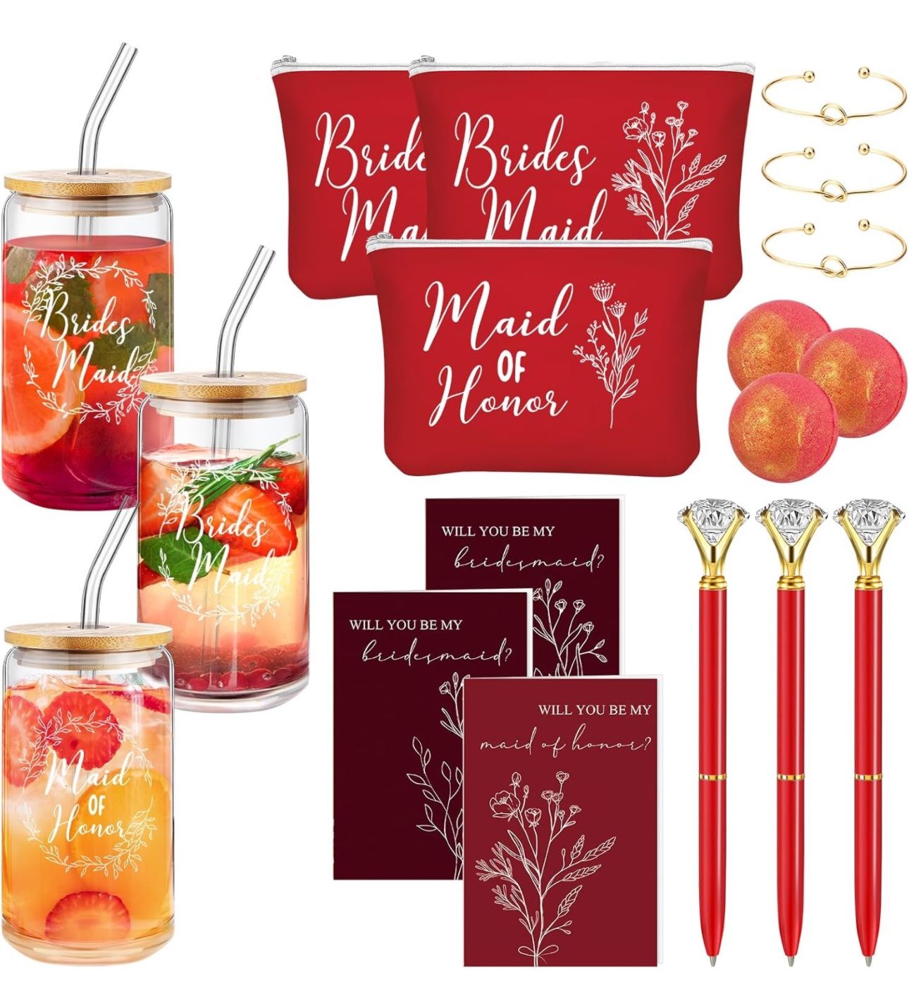 NEW/SEALED 18 Pcs Wedding Bridesmaid Proposal Gifts Maid of Honor Gifts Include Glass Cups Floral Makeup Bag Bath Salt Ball Bracelet Invited Card Diamond Pen for Bridal Shower Party Favors(Red) Description Features: The wedding bridesmaid gifts include 3 cotton canvas makeup bags with dimensions of 9 x 6.7 x 1.6 inches. These stylish and practical bags are spacious enough to accommodate your daily makeup items. Included in this package are 3 silver bridesmaid bracelet, ideal for most people. These pieces are a charming touch to the bridesmaid gift set, exuding sophistication and style to compliment any outfit on the big day. Specifications: Material: Bridal glass cups: soda lime glass, bamboo lid, high borosilicate straw Canvas makeup bags: cotton Folding cards: double copper paper Salt bath bombs: bath salts and essential oils Color: red Size: Bridal glass cups: about 5.2 x 2.99 inches/ 13.2 x 7.6 cm, 16 oz/ 500 ml Canvas bags: about 9 x 6.7 x 1.6 inches/ 23 x 17 x 4 cm Folding cards: about 7.87 x 5.9 inches/ 20 x 15 cm unfold, 3.94 x 5.91 inches/ 10 x 15 cm folded Bath bombs: about 1.77 inches/ 45 mm, 1.4 ounce/ 40 g Package includes: 3 x Bridal glass cups 3 x Canvas makeup bags 3 x Folding cards 3 x Diamond pens 3 x Bracelets 3 x Salt bath bombs Notes: Manual measurement, please allow slight errors on size. The color may exist a slight difference due to different screen displays. Our product is not suitable for sensitive skin. Test whether there is any allergy on a small part of your skin before use. Please stop applying if there is any discomfort. Features & details Exceptional Bridesmaid Gift Sets: this comprehensive bridesmaid proposal gifts include 18 practical items designed to cover every bridesmaid's need, which include 3 bridal glass cups, 3 bridesmaid cosmetic bags, 3 salt bath bombs, 3 folding invitation cards, 3 diamond pens, 3 bracelets; From elegant bridal glasses to functional makeup bags and relaxing bath bombs, surprise your bridal party with these complete and thoughtful kits Ideal Bridal Party Gifts: the bridesmaids gifts for wedding day in our package are ideal as bridal party gifts for friends, family, neighbors, co-workers, or others who will be bridesmaids; They not only stand out for their quality but also for their unique design and practicality Soda Lime Bridal Glasses: the set of 3 bridesmaid cups are made from quality soda lime glass and come with a bamboo lid and high borosilicate straw; Sized at 5.2 x 2.99 inches and with a liquid capacity of 16 oz, these cups will be ideal accompaniments at any bridal party Indulge with Relaxing Bath Bombs: unwind and soak away your stresses with our bath bombs in the bridesmaid gift; These 1.77 inches, 1.4 ounces bath bombs are safe, mainly made from bath salts and essential oils; These individually packaged bath bombs ensure a safe, luxurious bath experience Charming Folding Cards for Memorable Invitations: double copper paper folding invitation cards are a cut above the rest when it comes to elegance; With unfolded dimensions of 7.87 x 5.9 inches that fold to 3.94 x 5.91 inches, these cards showcase an exquisite floral design; The bridesmaid proposal sets also include 3 smooth writing diamond pens, adding a style of class to your invitation process