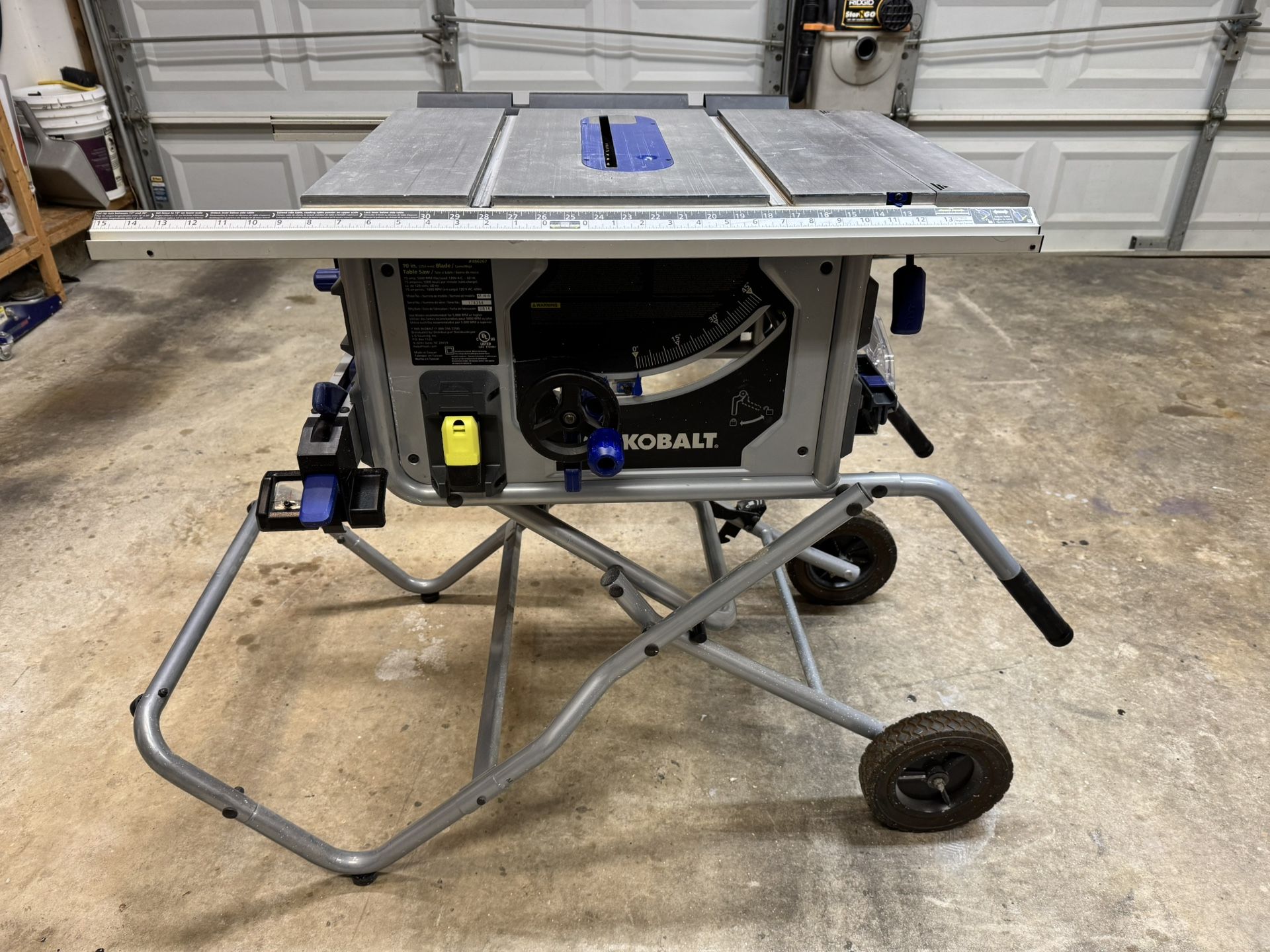 Good condition -- Kobalt 15-amp 10-in table saw comes with a quick-folding rolling stand and a durable 10-in carbide-tipped blade 15-Amp motor generates 5,000-RPM for easy completion of jobsite and workshop tasks 30-In right rip capacity and 17-in left rip capacity easily accommodate larger pieces Sliding tab fence system with single latch for accuracy and fast setting Locking miter gauge allows for a wide variety of cross, rip, miter and bevel cuts Quick-folding stand with 8 in wheels for portability, easy vehicle loading and convenient storage On-board storage for rip fence, miter gauge, blade guard assembly, push stick, power cord and extra blades keeps items secure when not in use 2.5-in dust collection port conveniently fits a vacuum or dust collector