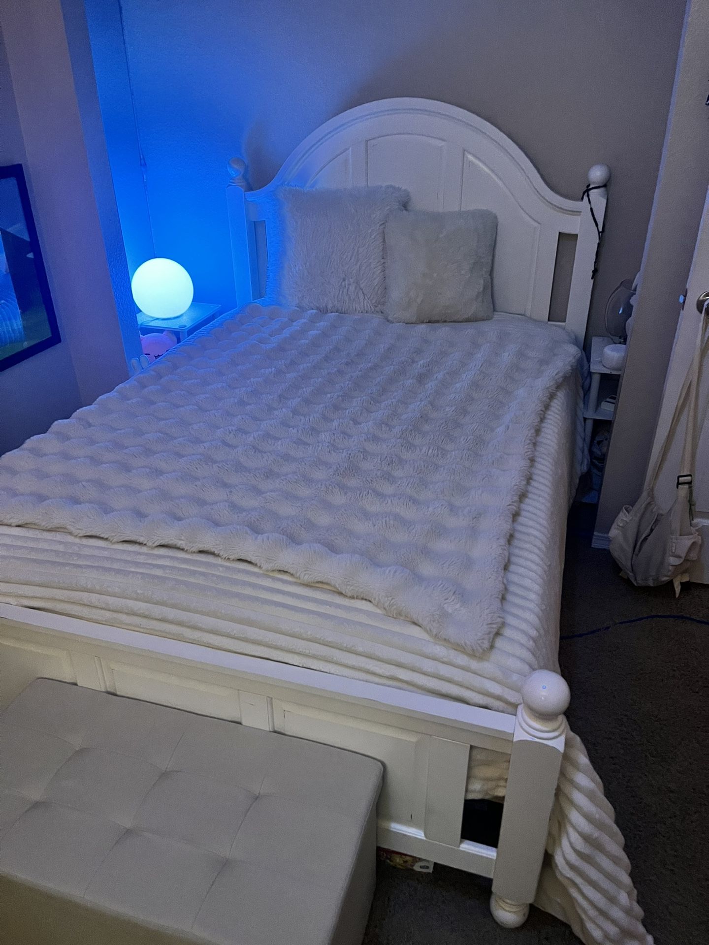 White Full Bed frame. Great condition. Great quality. Real wood. original price was over $500. Other pieces of set available. Desk-Large dresser w/mirror- side dresser