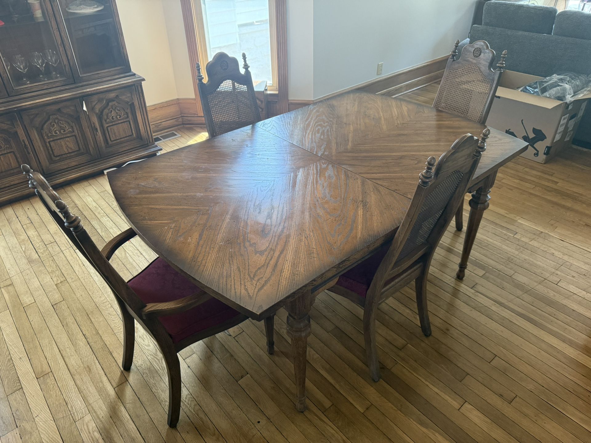 Stunning solid wood dining table and chairs. Comes with 2 leafs to expand the table. This set is in excellent condition, built to last, and features gorgeous wood grain and craftsmanship you don’t find in today’s furniture. Comes with 2 leaves for expanding the table. Can offer delivery for $50. Dimensions without the leaves: 66” L x 42” W x 29.5” H Leaves are 18” wide each and there are 2 Solid wood. Intricate detailing on both table and chairs. From a smoke-free, pet-free home