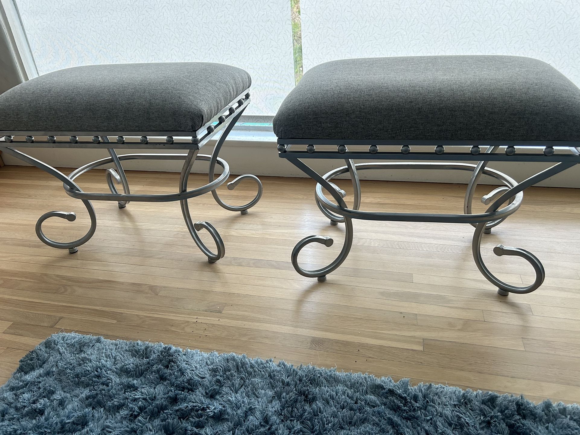 Set of 2 grey fabric and silver stools or ottomans- excellent condition very sturdy. Great for any room, sitting on or decorating.