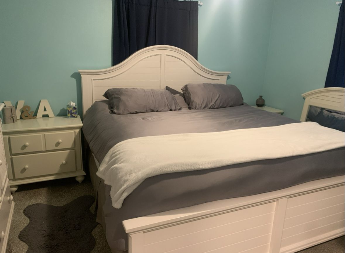 All white, solid wood bedroom set. King sized bedframe, two nightstands with usb charging ports and additional outlets, large dresser with mirror.