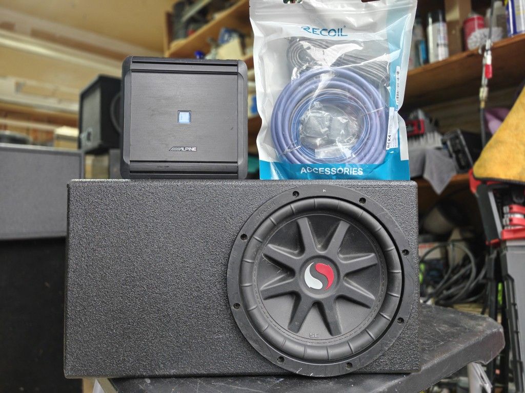 Kicker Solo Classic 10" subwoofer in a brand new rhinolined Qbomb ported box. Alpine MRV-500 amp powers it perfectly as well as a new 4ga wiring kit. Adds a lot of bass in a small footprint.