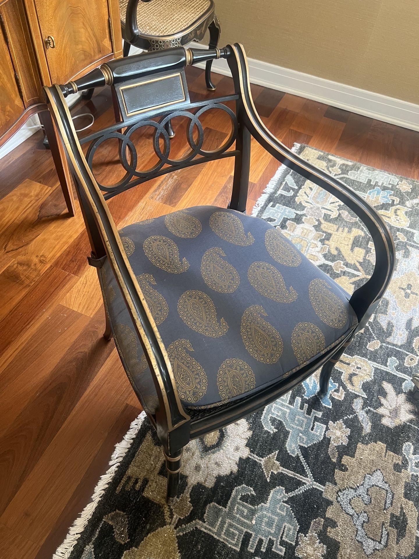 10 beautifully crafted Baker dining chairs. French provincial design with cane seats and accompanying seat cushions. There are 4 armchairs and 6 regular dining chairs. Black with gold trim. 1 chair with slight tear will be free!