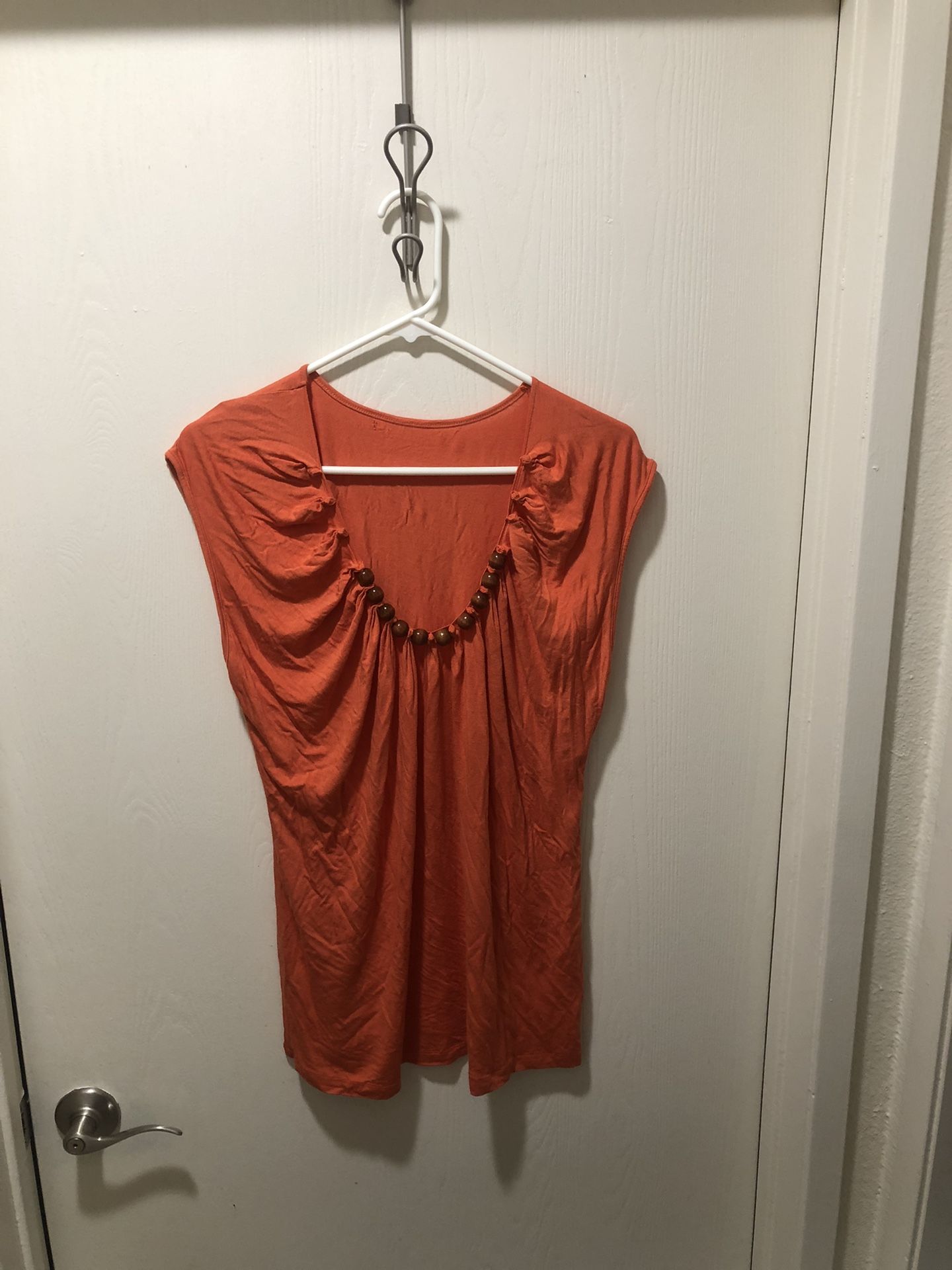 Orange blouse Beaded front Wood beaded front very beautiful Elegant blouse No tag or brand, I’m going to say it’s a size large Has a little tiny hole on the back but you can either sew it up, easy fix or just wear your hair down or if you wear a cardigan it’s not noticeable Short sleeve orange blouse Flowy orange blouse Perfect for spring and summer Business casual