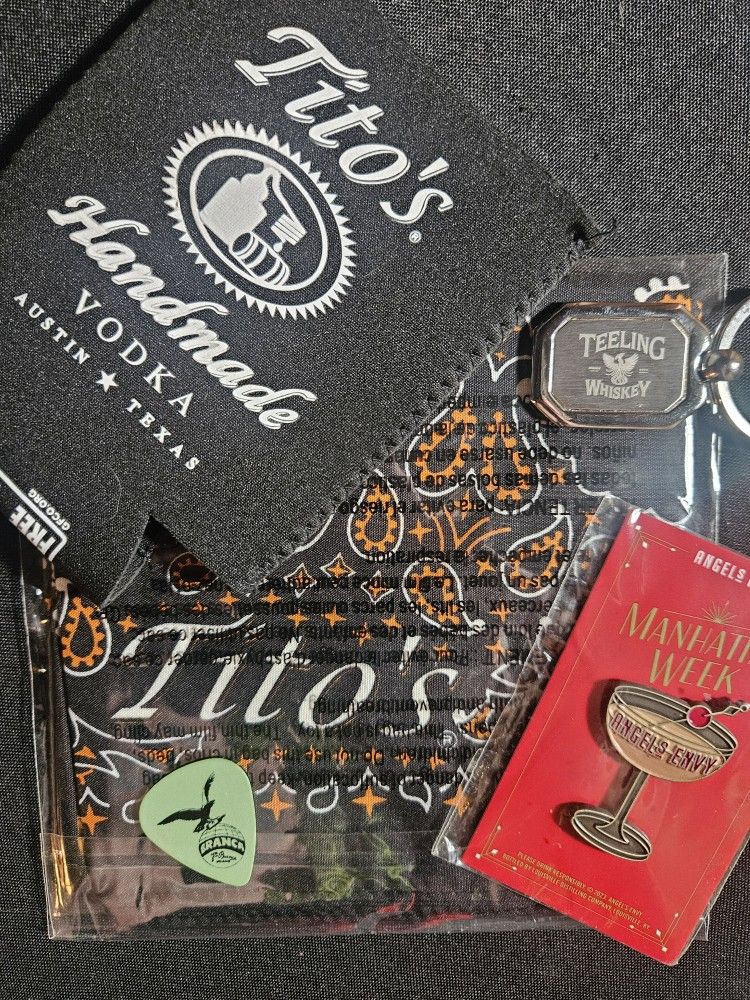 Eight pieces: *Tito's Vodka koozie *Tito's Vodka bandana *Angel's Envy Bourbon pin *Teeling Whiskey keychain *Fernet-Branca guitar pick *Dickel fanny pack *Golden Road Brewing sunglasses *Tito's Vodka sunglasses $20 Cash, Venmo, Zelle, or Cash App