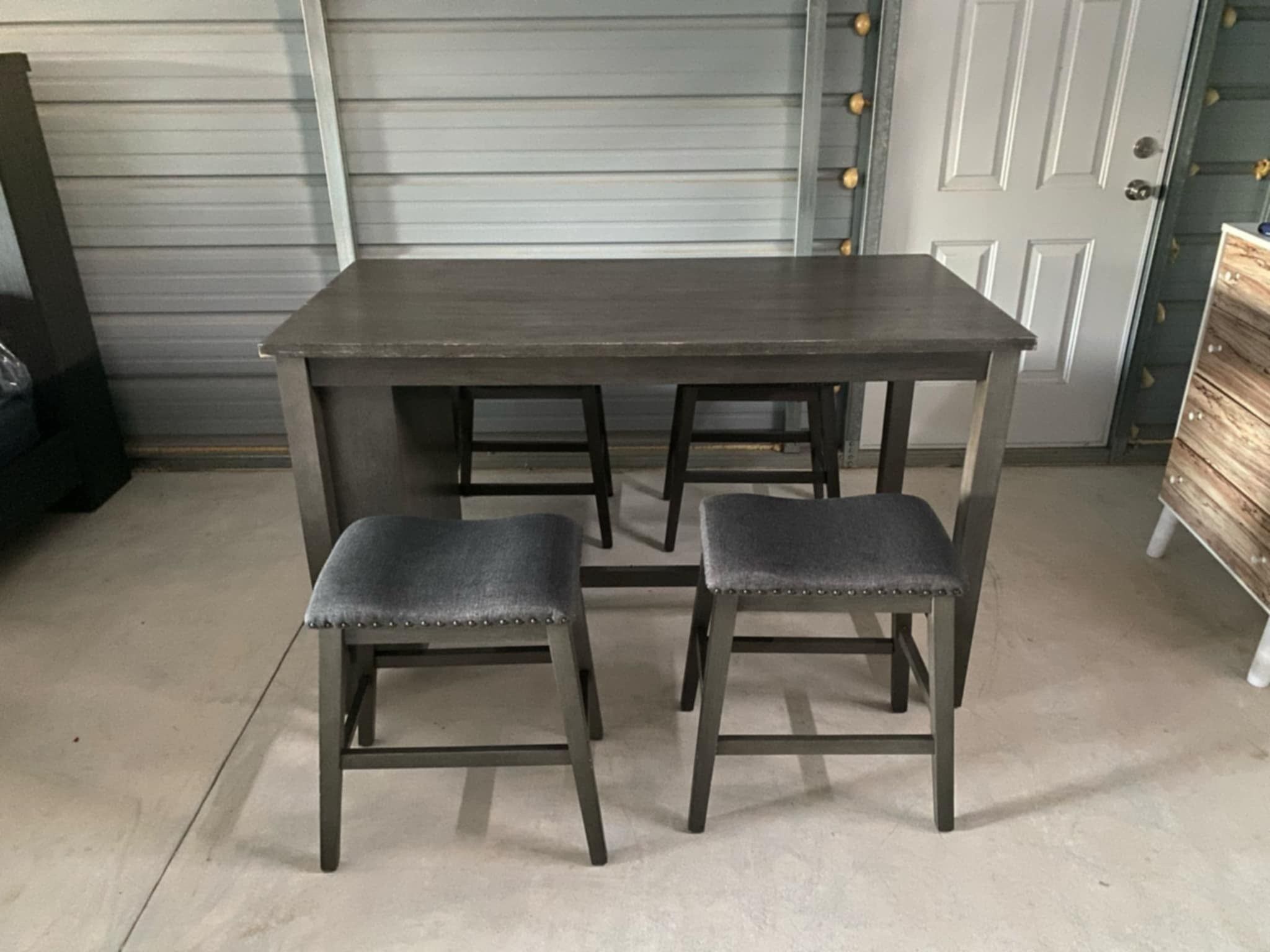 In good condition the table does have a few scratches and minor chips on the sides but no broken parts it's really sturdy and solid. It does have a 3 shelf on the side but it is removable. The stools are in good condition as well they do have a few scratches and minor chips in some places but no broken parts and all are really sturdy and solid. See pictures for more details.. (Free Delivery If Needed) Dining table measurements… Length- 60” Width- 30” Height- 36”1/4 Shelf measurements Height- 28”1”8 Width- 23”3/4 Depth” 7” Stool measurements… Height- 23” Length- 18”