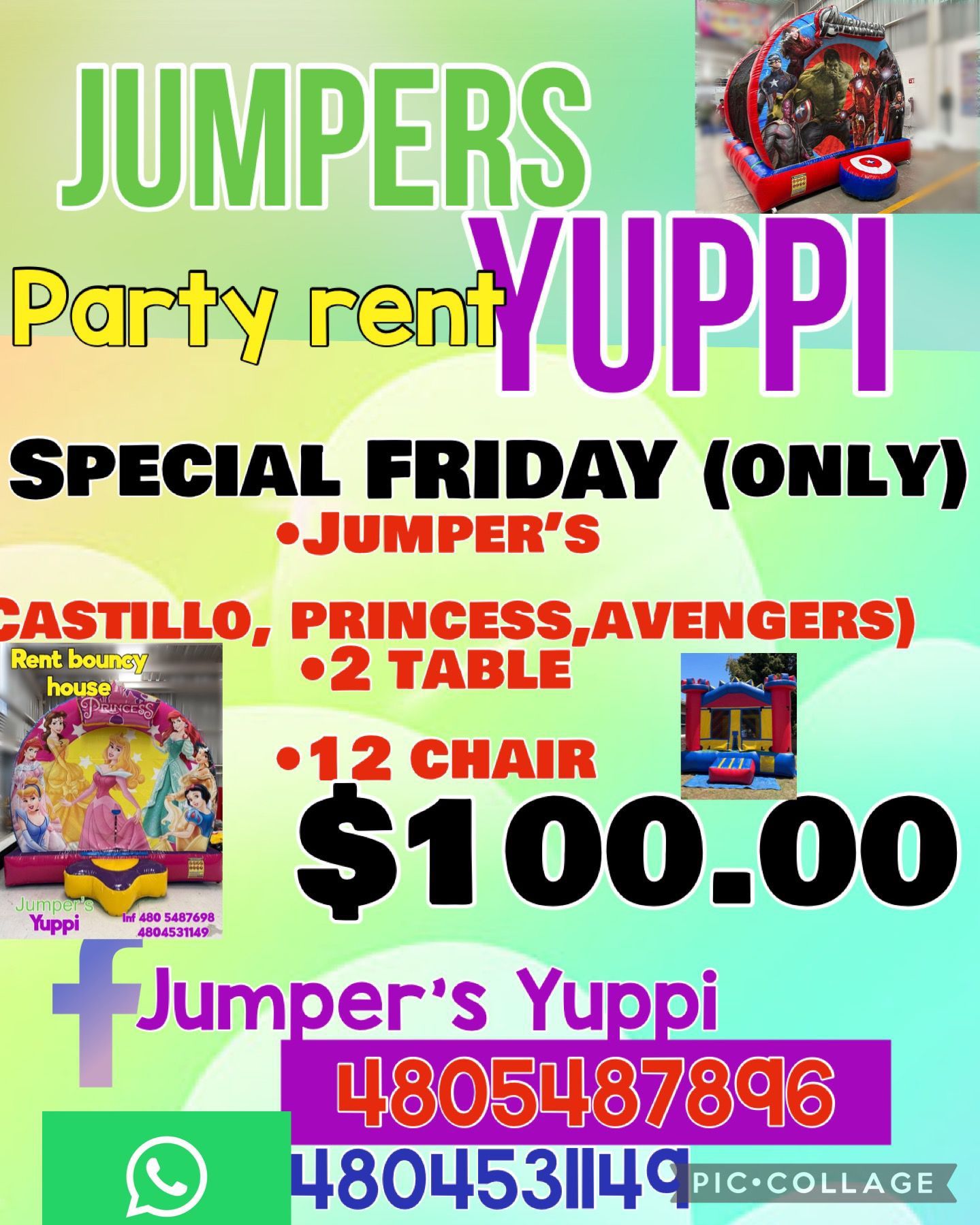 Special Friday ~2 Tables / Mesas ~12 Chairs / Sillas ~Jumper Yuppi Avengers,Princess,Castle For only $100