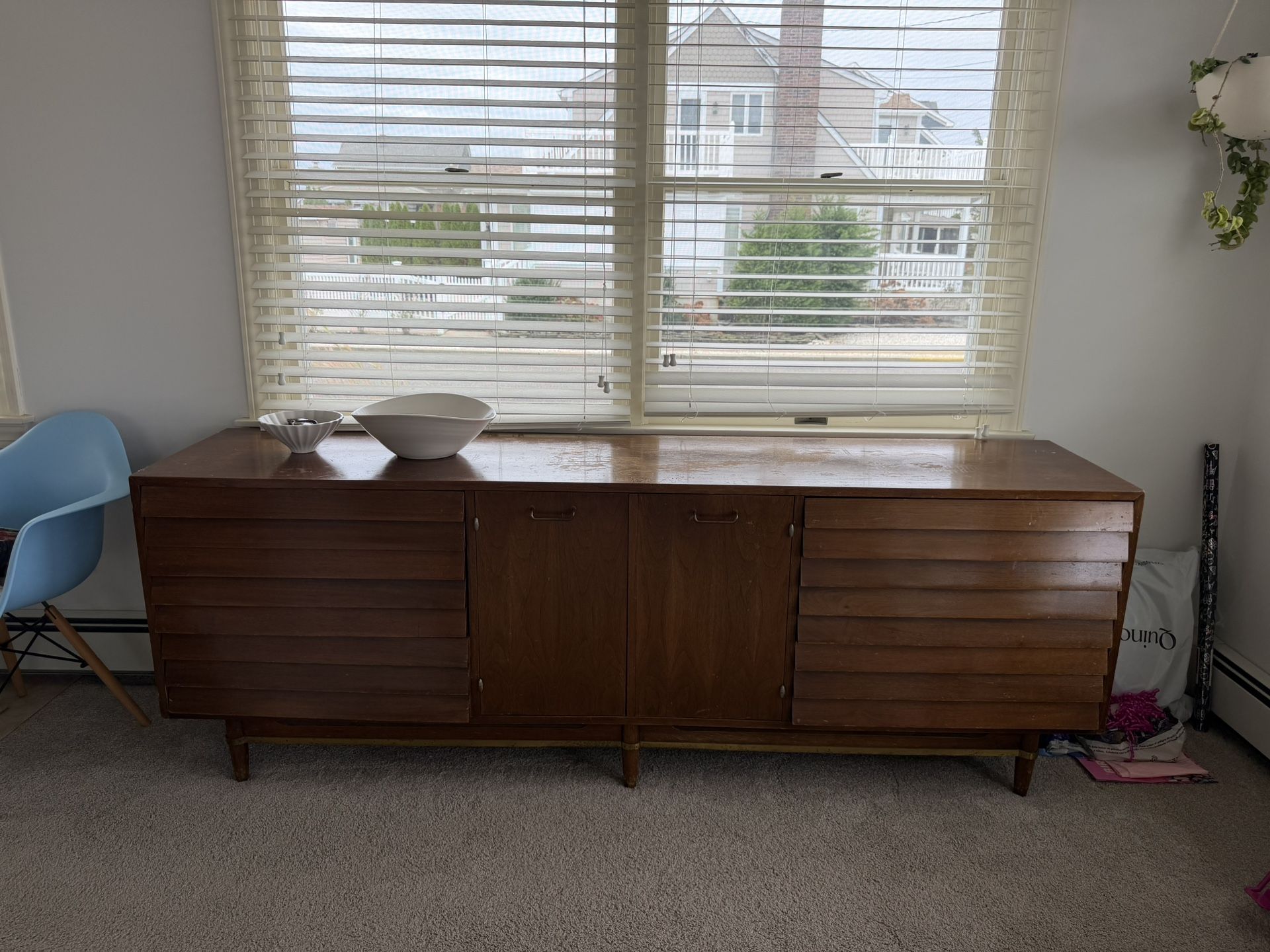Original liners inside drawers - amazing craftsmanship - surface has signs of water stains and needs refinishing. - has large matching floor mirror for $150!