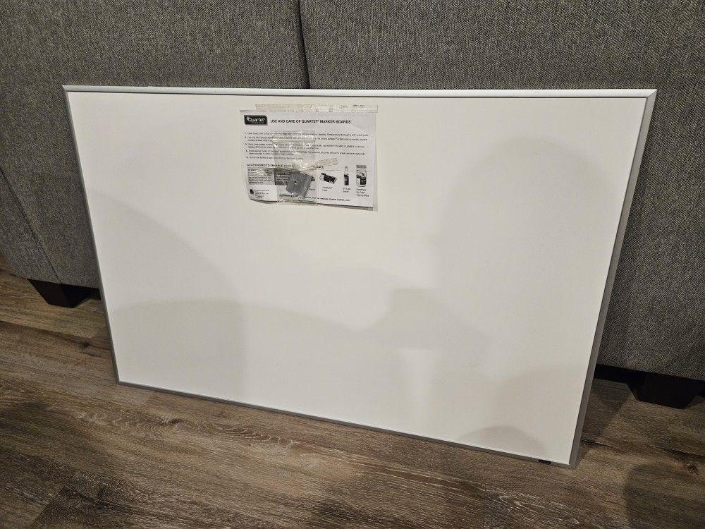 Quartet white dry erase board with 2 markers and eraser. Eraser holds the two markers. Includes hanging hardware. Non-magnetic. Aluminum frame. Perfect for home, office, or school. 36"W x 24"H. OBO