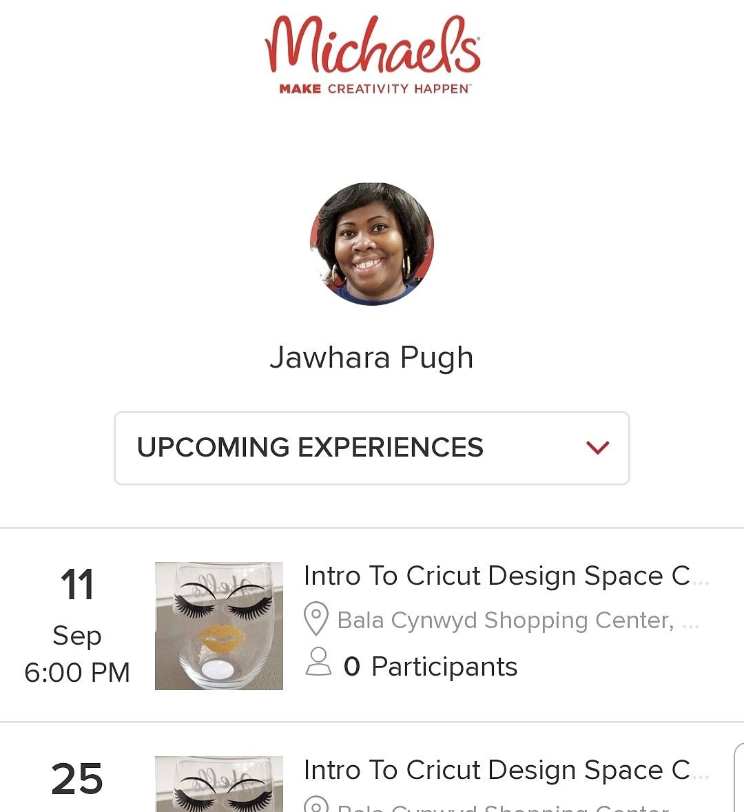 Hello. I have 3 new classes posted on Michael's Website. September 11, 2019 @ 6PM September 25, 2019 @6PM October 9, 2019 @ 6PM ***You must have a Cricut Explore Air One, Explore Air, Explore Air 2 or Cricut Maker. All other machines are obsolete and I have no knowledge of them. You must register for the class o the Michael's Website. *{url removed} *Scroll down towards the bottom of the page *Click on "community classroom, view in‐store classes" *In the location field put Bala Cynwyd, I should pop up *If not just scroll until you see my picture 😊