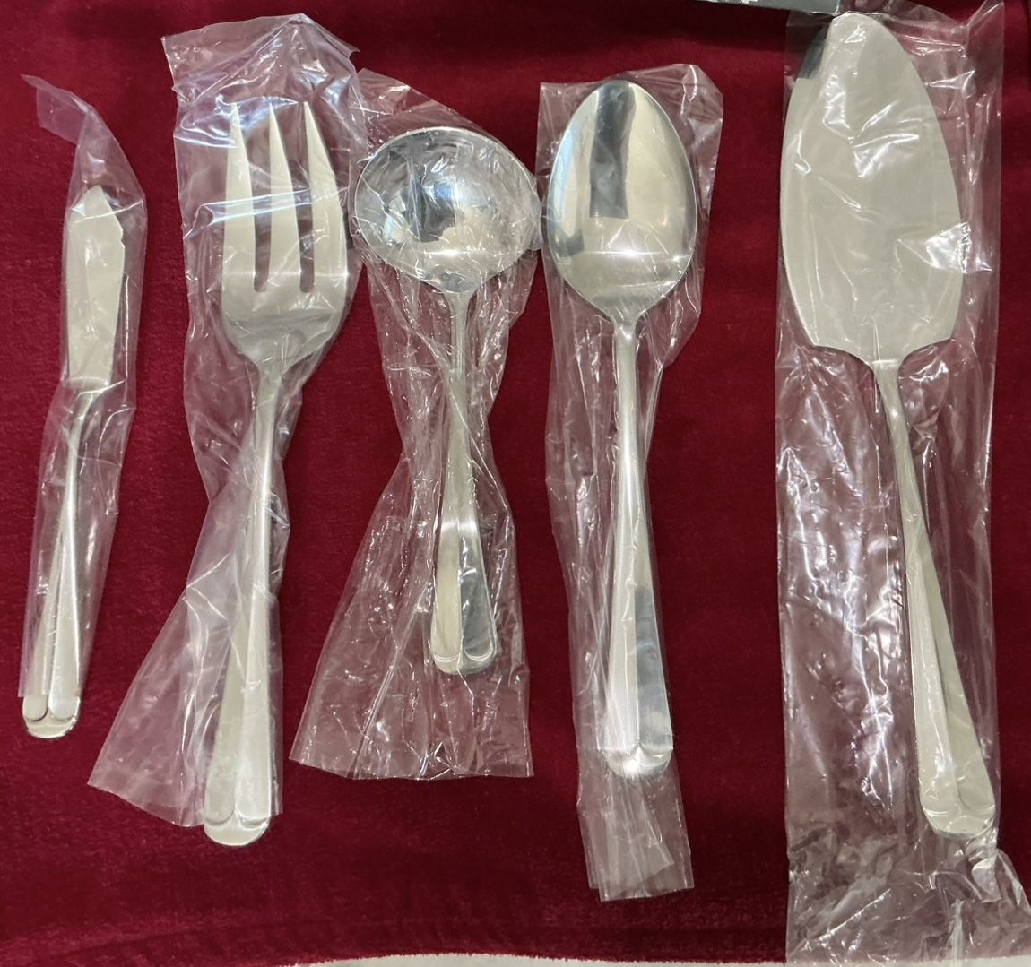 New in box 5-piece stainless steel hostess set from Bloomingdale’s The set is in the original box and each piece is in its original plastic sleeve Set includes: Butter Knife Table Spoon Serving Fork Gravy Ladle Pie Server Estate/vintage, purchased in 1989. While the box shows some scuff marks/signs of wear, the pieces have never been used. See my other listings for a matching NIB 20-pc set of stainless steel flatware. That item includes: 4 dinner knives; 4 dinner forks; 4 salad forks; 4 soup spoons; and 4 tea spoons. Pick up in 78645/Lago Vista, TX
