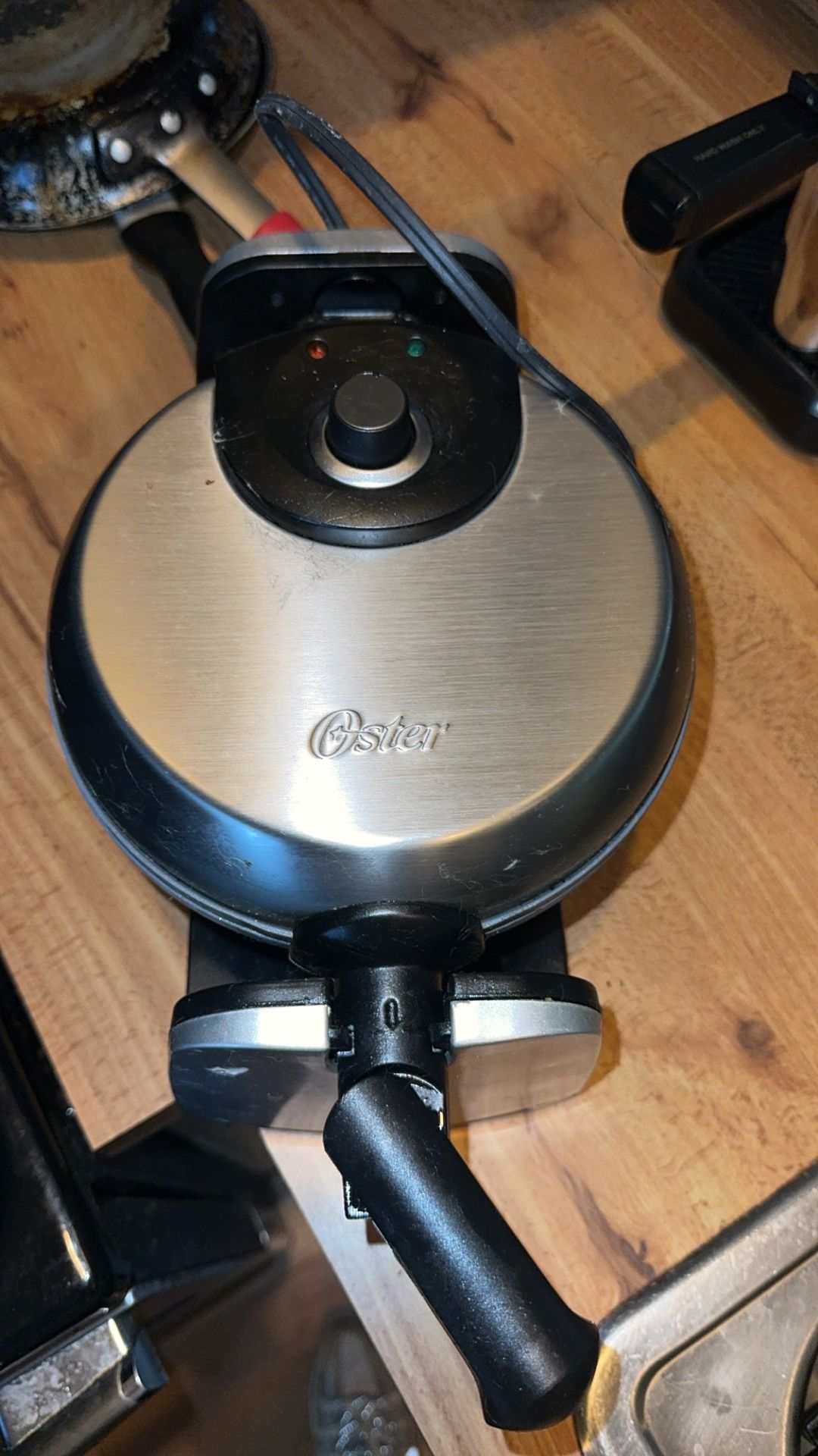 Make perfect golden waffles every time with this Oster flip-style Belgian waffle maker. Features include: • Rotating handle for even cooking • Adjustable temperature control • Non-stick plates for easy cleanup • Power & ready indicator lights Works great and heats up fast. Ideal for weekend breakfasts or daily waffle lovers. 🧇 Clean, tested, and ready to use!