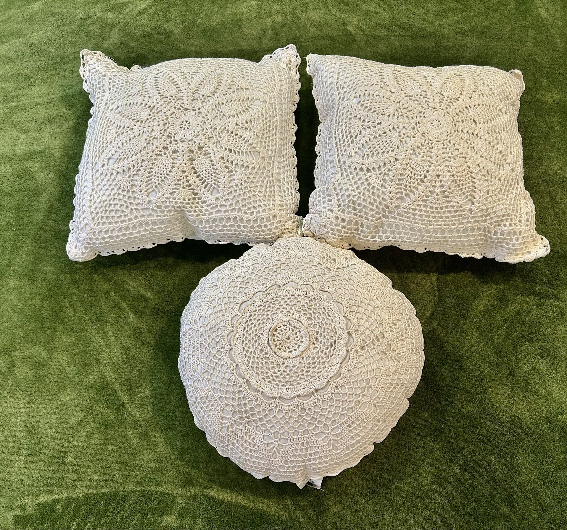Vintage 1980’s, 100% cotton, floral crochet accent pillows. All are in very good condition for age and use. See photos for condition. Set includes: 2 square (14x14) 1 round (14x14)