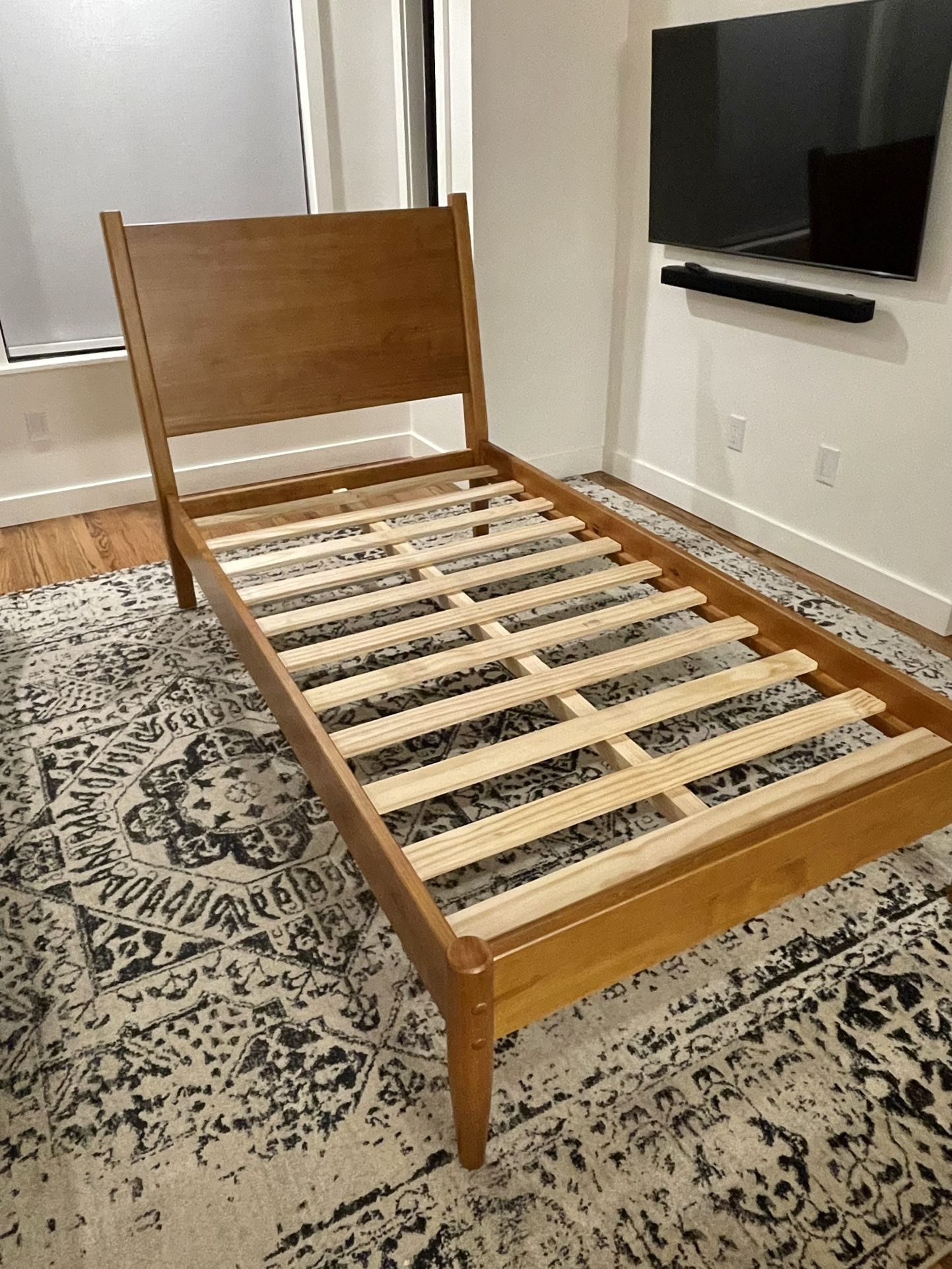 Stylish mid-century modern design bed frame. Super sturdy and solid. Smooth wood surface and tapered legs. This is a beautiful bed frame. Like new, we bought it brand new not long ago but my son grew overnight and needed a bigger bed already. Included: headboard, footboard and center supports.
