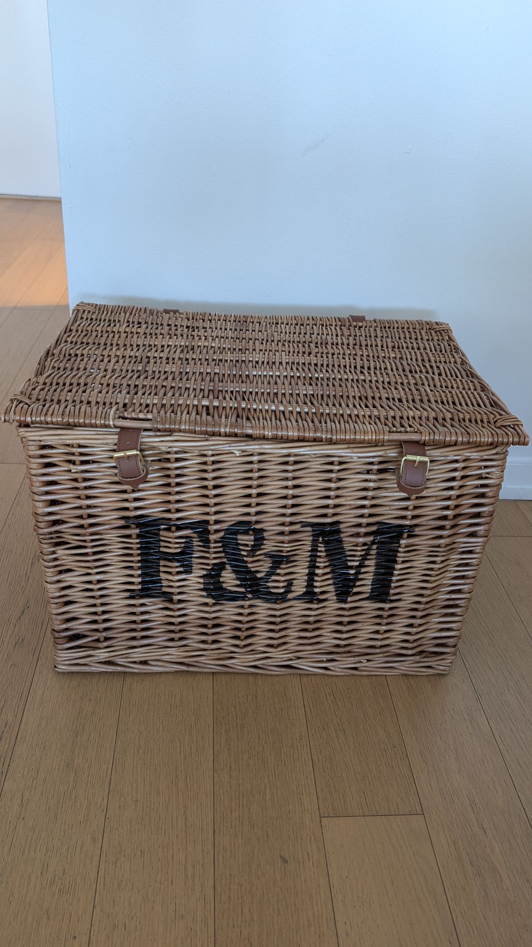 Large Fortnum & Mason wicker hamper basket. Originally from a Fortnum & Mason Christmas hamper. Great for blanket storage, decor, or storage trunk. Very sturdy and in excellent condition. Dimensions approx: 23” W × 16” D × 15” H 2 available – $30 each. Pickup near Columbus Circle / Lincoln Center.