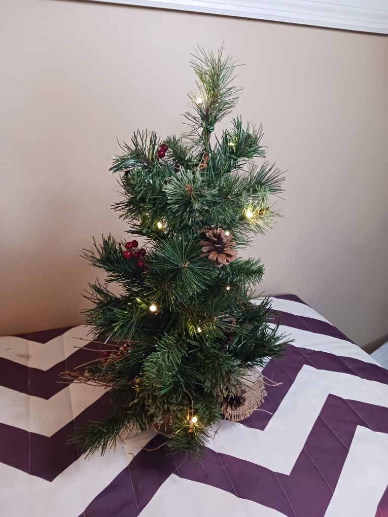 24 inch tall pre lit Christmas tree. Lights powered by 2 AAA batteries. Must be picked up in Raymore.