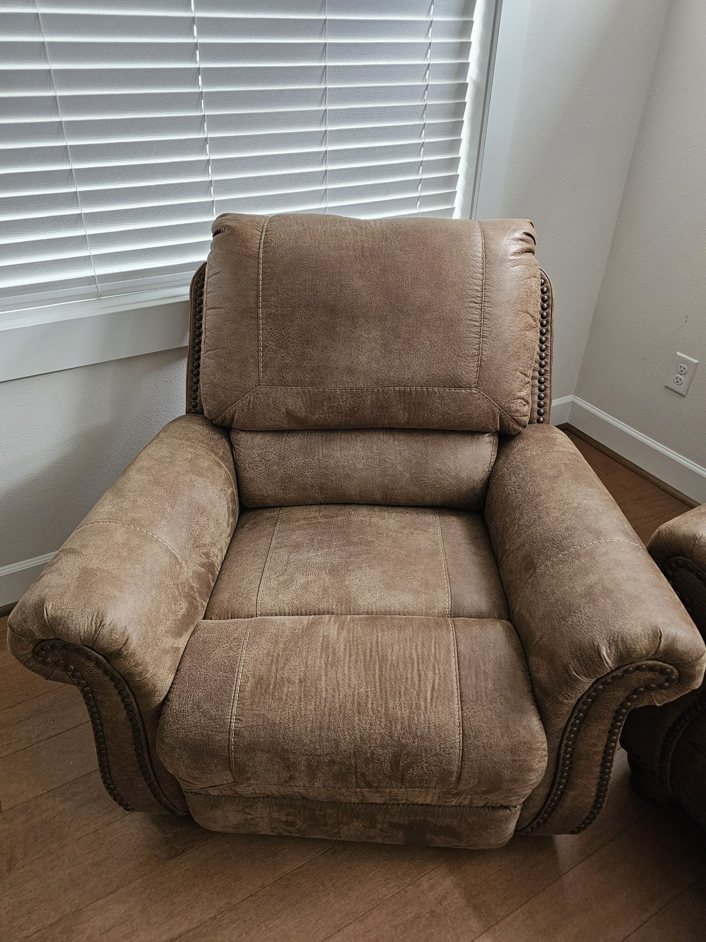 Matching Recliner/couch/loveseat. Less than a year old from Ashley furniture. Moving and need gone in 2 days! 3 black tables. I can give measurements if interested. Need gone! Make me an offer! Black couch in photo is not for sale. I can deliver if somewhat close to Issaquah. I need this stuff gone!