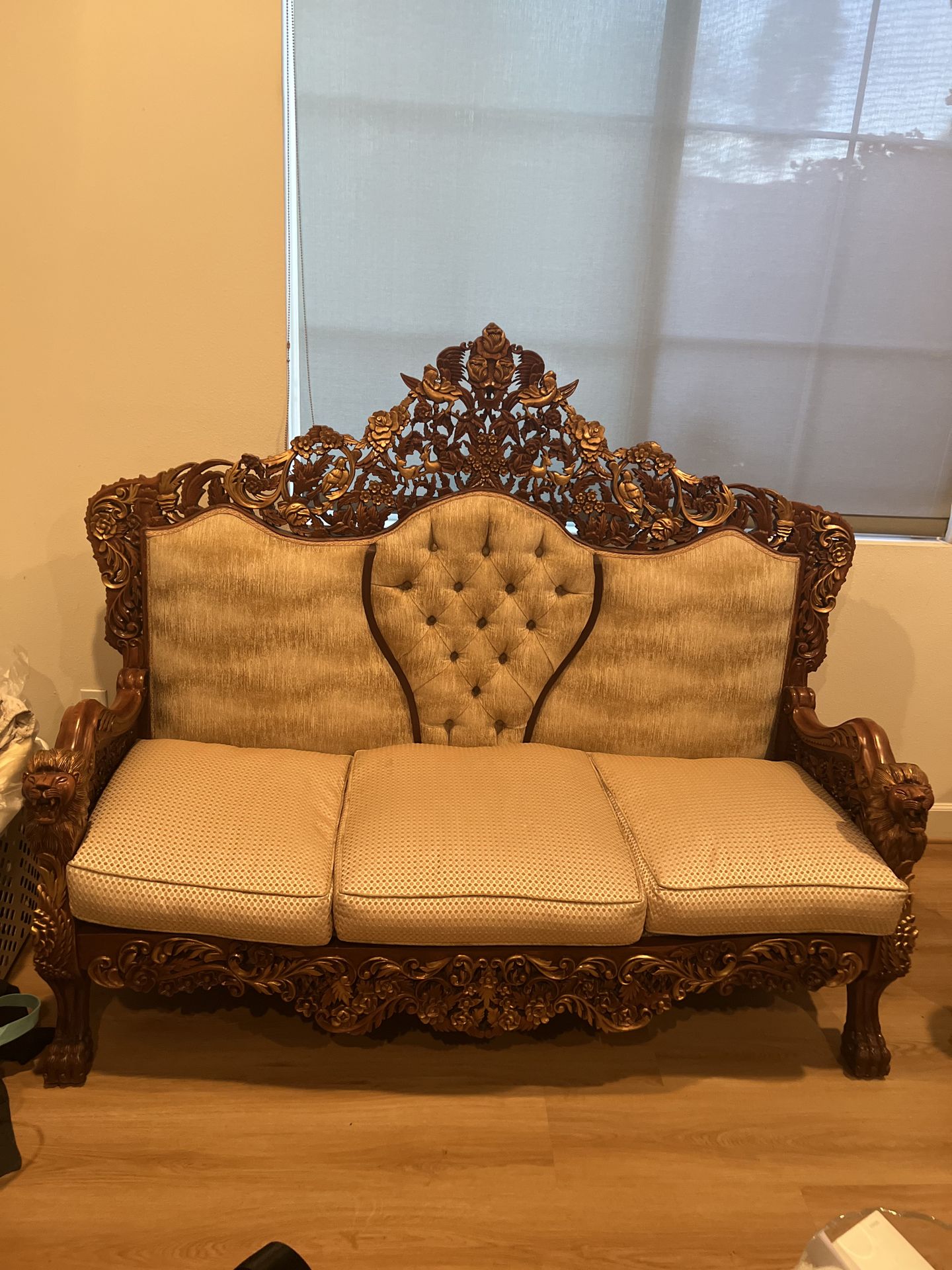 Stunning handcrafted set, very detailed and high-end. Includes 1 sofa, 3 chairs, and coffee table. Original price: $7,000 Selling for: $____3/500 Don’t miss this deal – first come, first serve
