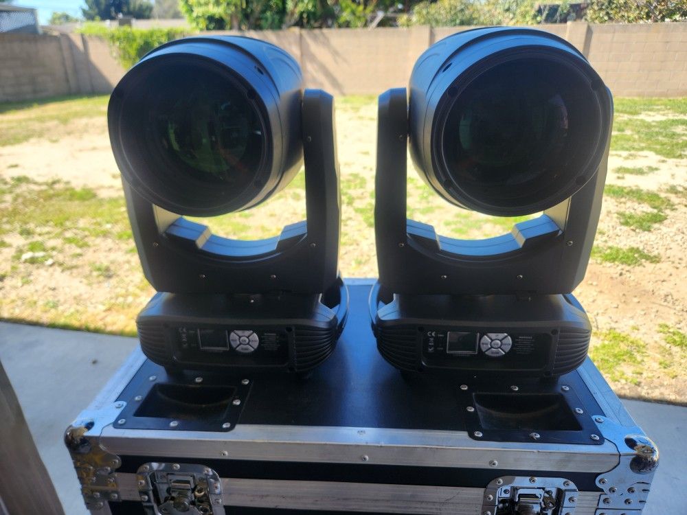 Awesome pair of 260W moving head lights. Great for events or stage setups. Comes with a sturdy flight case for easy transport and keeping them safe. Each light has DMX in/out and power connections. Ready for your next gig!