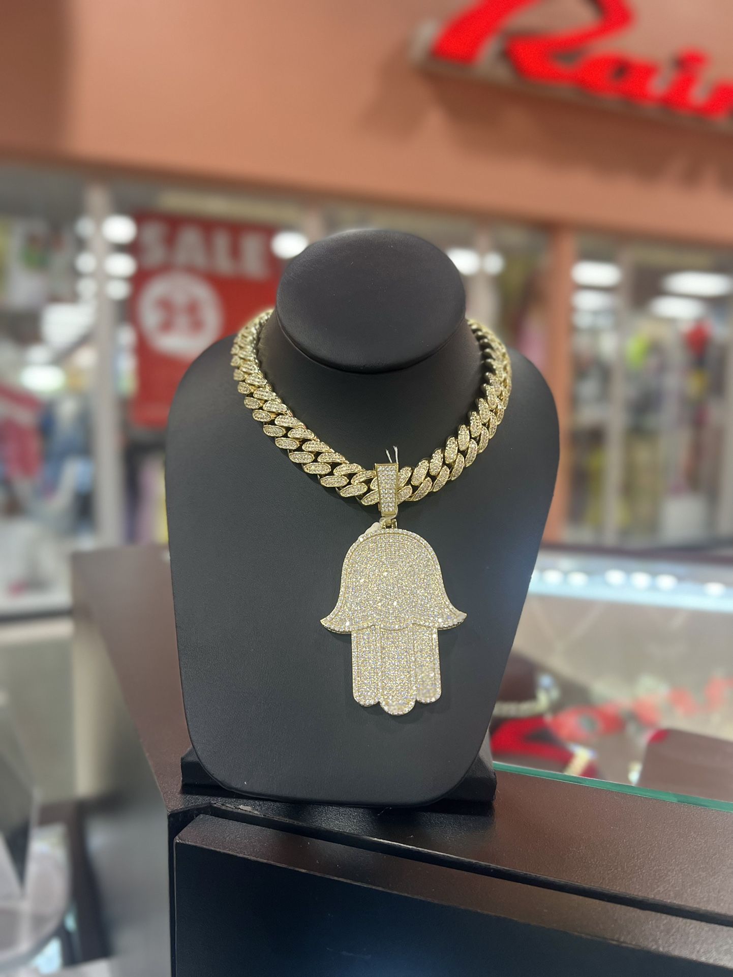 Large Khamsa Pendant available in Gold And Silver finishes. Chain: 14mm Cuban link Chain Lenght: 24” Stones: Cubic Zirconia Inlay Technology: Micro Pave