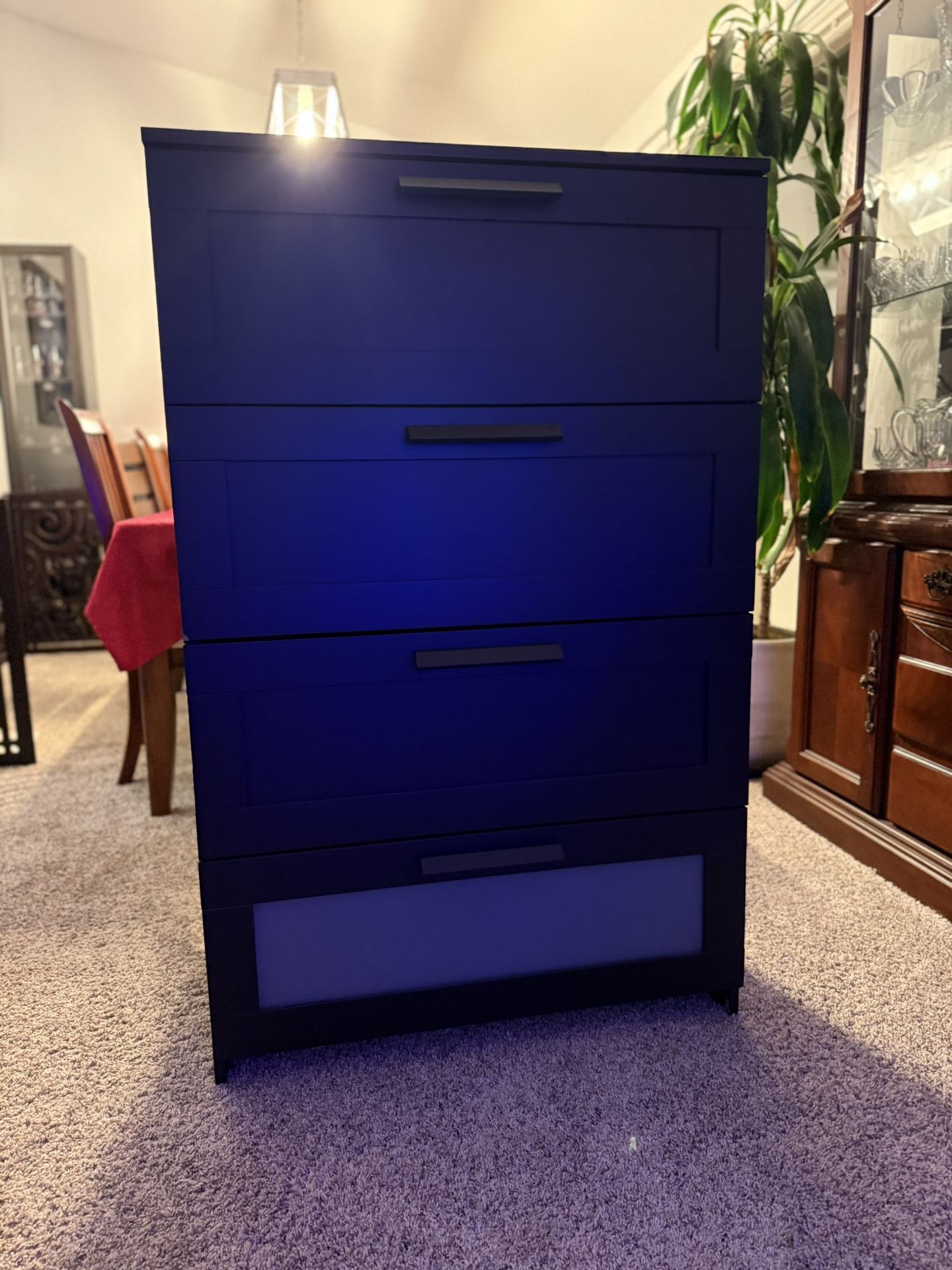 Sleek, modern, and highly functional, this IKEA BRIMNES 4-drawer dresser is a perfect storage solution for bedrooms, guest rooms, or apartments. Finished in classic black with a frosted glass front on the top drawer, it offers a clean, contemporary look that pairs easily with any décor style. With four spacious drawers, there’s plenty of room for clothing, accessories, or everyday essentials, helping keep your space organized and clutter-free. The smooth drawer design and solid construction make this a reliable and stylish piece you’ll enjoy for years. Details: • Model: BRIMNES • Color: Black with frosted glass top drawer • Dimensions: 31” W x 48” H x approx. 16” D • Condition: Gently used, well cared for This dresser regularly sells for over $220 new. Priced at $120, this is an excellent opportunity to own a timeless IKEA favorite at a great value. Don’t miss out; get it before it’s gone.