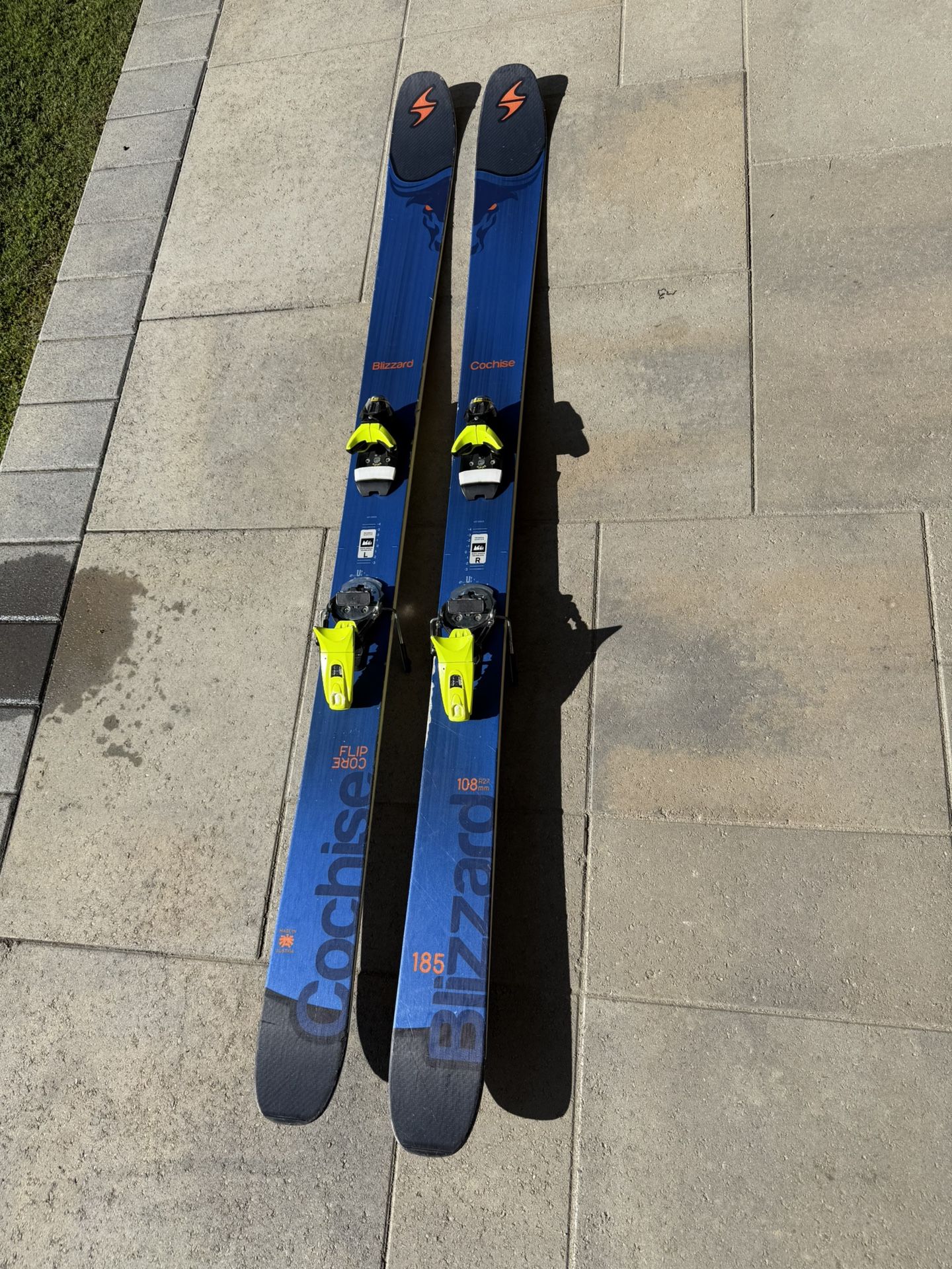 185cm blizzard Cochise skis used for all mountain skiing. Carbon fiber tips and tails to reduce swing weight. Metal sheets in the core for stability. Set to 29.5 boot size. Slight rocker and 108mm under foot. Look dual Pivot 12 bindings in neon yellow. Skis were originally purchased for $800+ and bindings for $350+. Used for 3-4 seasons and about 25 total days. Still in good condition.