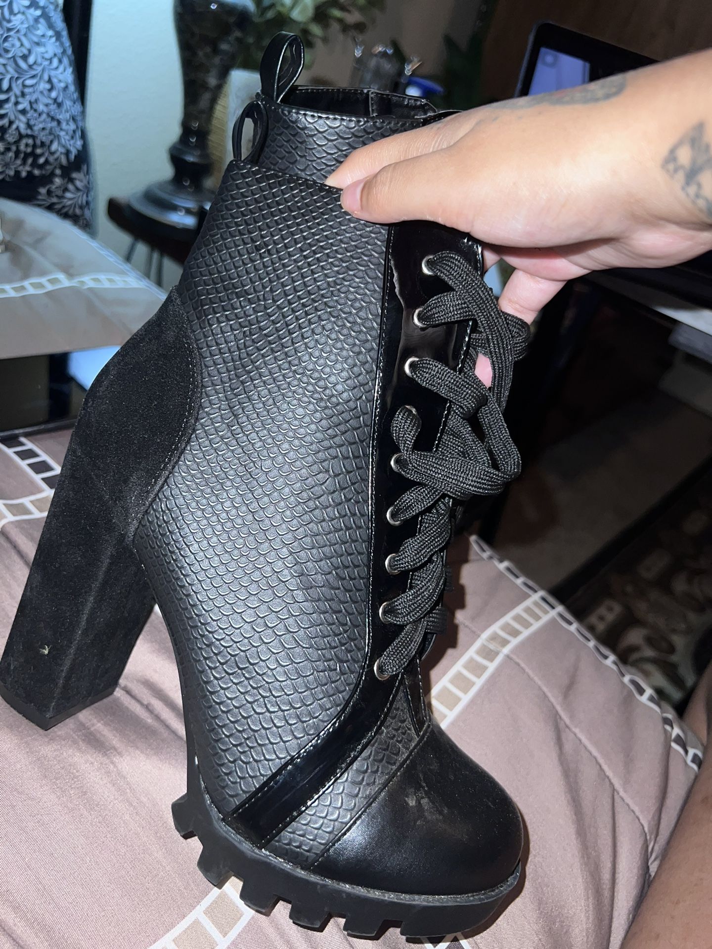 Size 8 women’s combat heel boots. Black with a leather design, the heel is a velvet texture. Purchased on fashionova or shoe dazzle I can’t remember lol. I don’t have the original box for them sadly but if purchased, more than welcome to keep this random Guess box I have put them in. Selling because I can’t walk in these plus I’m already tall