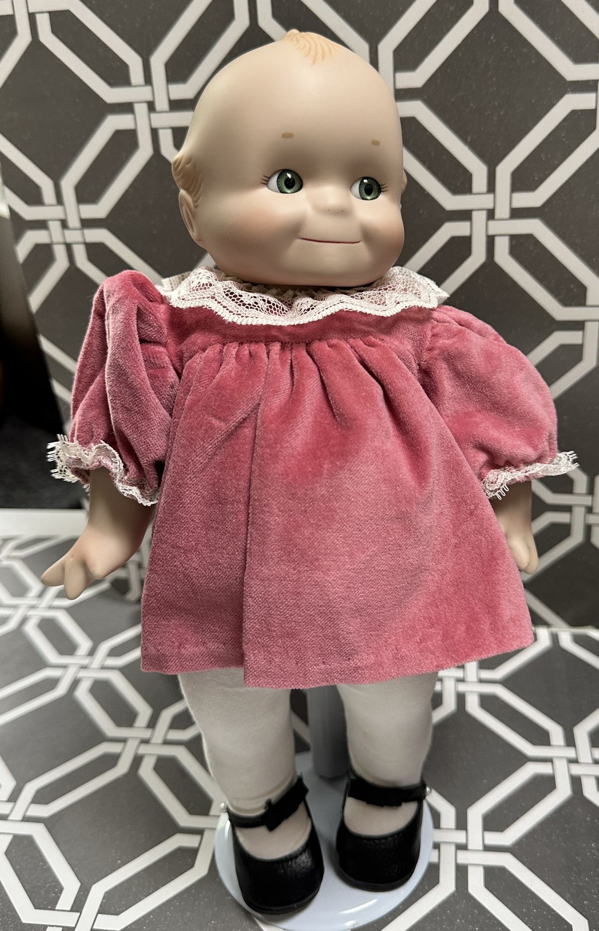 Ashton Drake 1997 Porcelain Baby Girl Doll And Stand New The Gene Collection Pink Dress Beautiful Green Eyes Whole Body is Porcelain Excellent condition