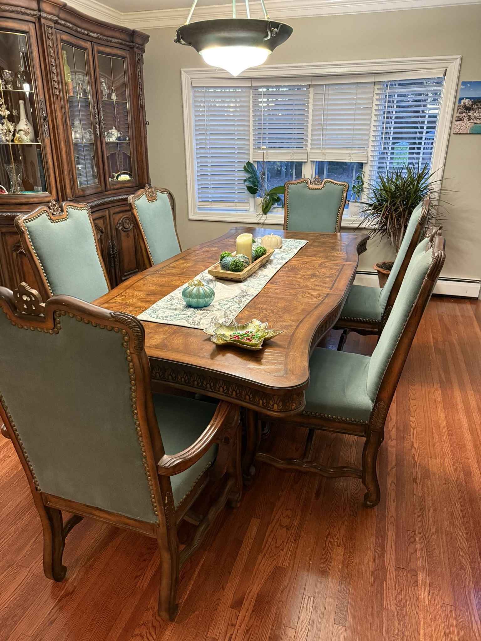 103” Carved Table • Tiffany/Teal Chairs • Lighted China Cabinet This stunning dining room suite brings the elegance of Old World European / Renaissance Revival craftsmanship into your home. Beautiful carved details, warm wood tones, and luxurious upholstery make this a true statement collection suitable for a formal dining room or estate setting. PICK UP ONLY 🏛 Grand Dining Table (103” with Leaf) • Length with 24” extension leaf: 103 inches • Width: 45.5 inches • Ornate carved apron • Rich patterned wood grain • Ideal for entertaining large gatherings (Shown with extension leaf installed) ⸻ 🪑 Six High-Back Chairs • 2 Armchairs + 4 Side Chairs • Upholstered in elegant Tiffany/Teal fabric • Nailhead trim • Solid carved wood frames • Comfortable and sophisticated ⸻ 🖼 Illuminated China Cabinet / Hutch • Length: 84 inches • Height: 7 feet (84 inches) • Depth: 24 inches • Beveled glass doors • Mirrored interior & interior lighting • Lower cabinet storage • Carved Renaissance-style details ⸻ ✨ Overall Style & Condition • Style: Old World European / Renaissance Revival (Comparable to Hooker, Bernhardt, Pulaski luxury lines) • Condition: very good and well cared for