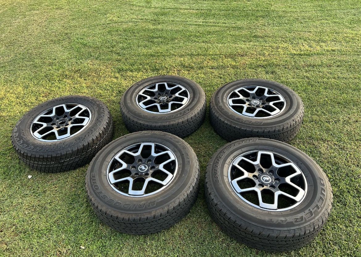Tires and wheels off a 2021 Ford Bronco. They have 7,000 miles on them and the spare has zero miles on it.