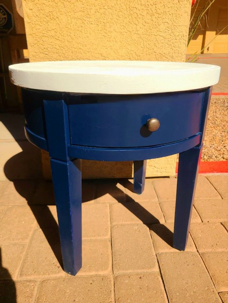 Signature Design by Ashley Furnature. A Beautiful Round Solid Wood Accent or End Table with 1 Sliding Storage Drawer ! Has a classic look with a modern appeal π Overall Great Condition- Could easily be painted whatever color scheme to match what you have already. Currently this is Painted in an Eggshell White Table Top and a Midnight Blue Body Frame! With a Brass Accent drawer pull. Measurements: 2ft x 2ft x 2ft! Add a touch of elegance to your living room with this Great 1-Drawer Round Wood Accent End Table by Ashley. With its French style construction and The Round shape of the table makes it a perfect fit next to your sofa or armchair in any living space! >Easy Pickup π» >Cash/ Zelle/Venmo $ >Delivery Maybe Available $ depending on Loacation!