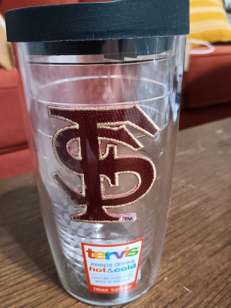 Brand New 16oz Tervis cup with lid. Perfect for taking your coffee or tea on the go!! And for your Florida State fans!