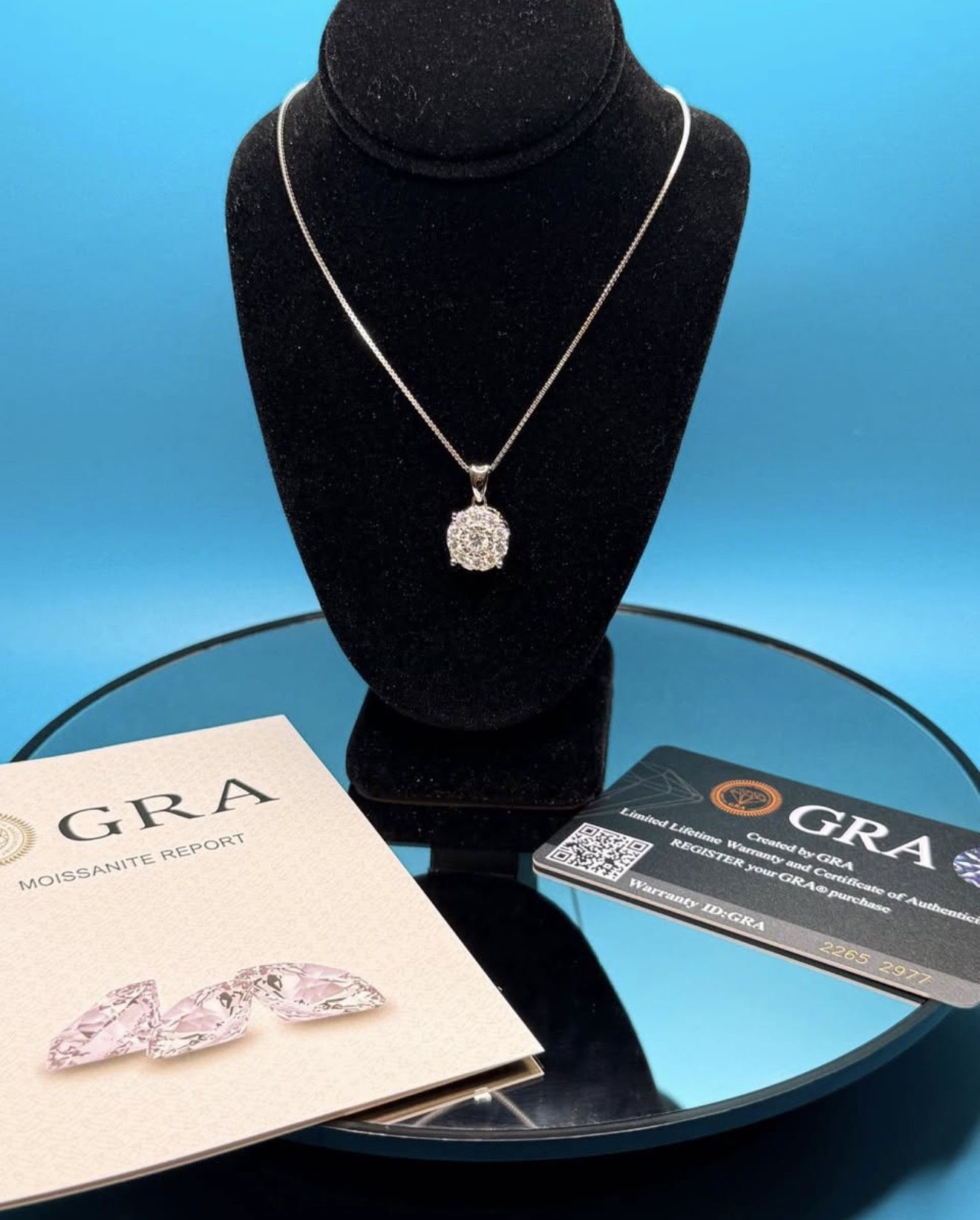 This beautiful, unique design necklace features a 925 sterling silver box link chain and a round pendant with brilliant color D moissanite stones. Each stone passes the diamond tester, ensuring authentic sparkle and quality. Crafted from 925 sterling silver, the necklace measures 18 inches for a classic, elegant fit. Comes with a GRA certificate and a black velvet necklace box for a polished presentation. Price: $150 A truly timeless and distinctive piece, perfect for special occasions or as a luxurious gift.