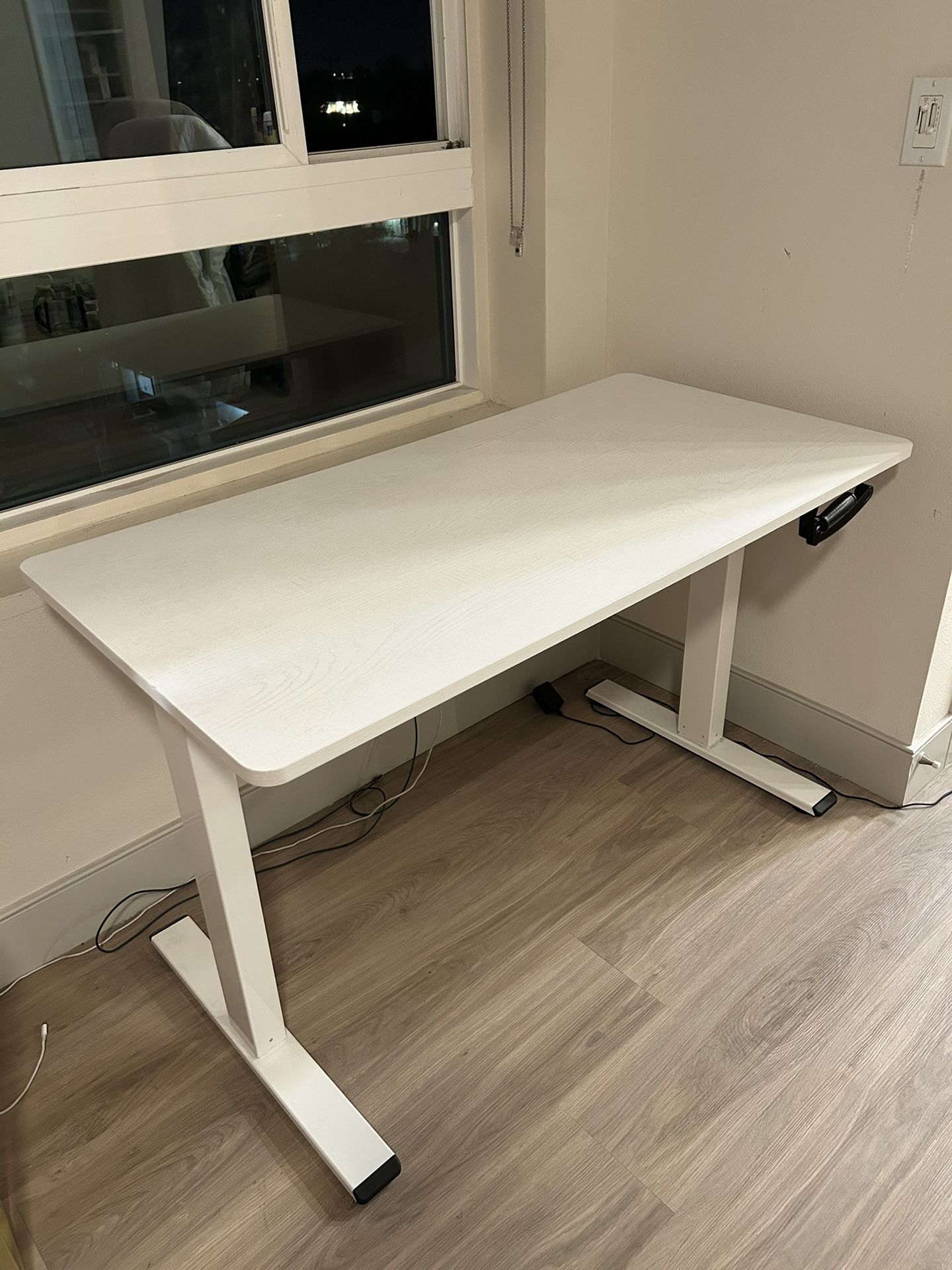 White manual standing adjustable desk with or without office chair. Small scratch on top of desk as pictured. No issue with function. Can throw in office chair if needed. Selling for best offer.