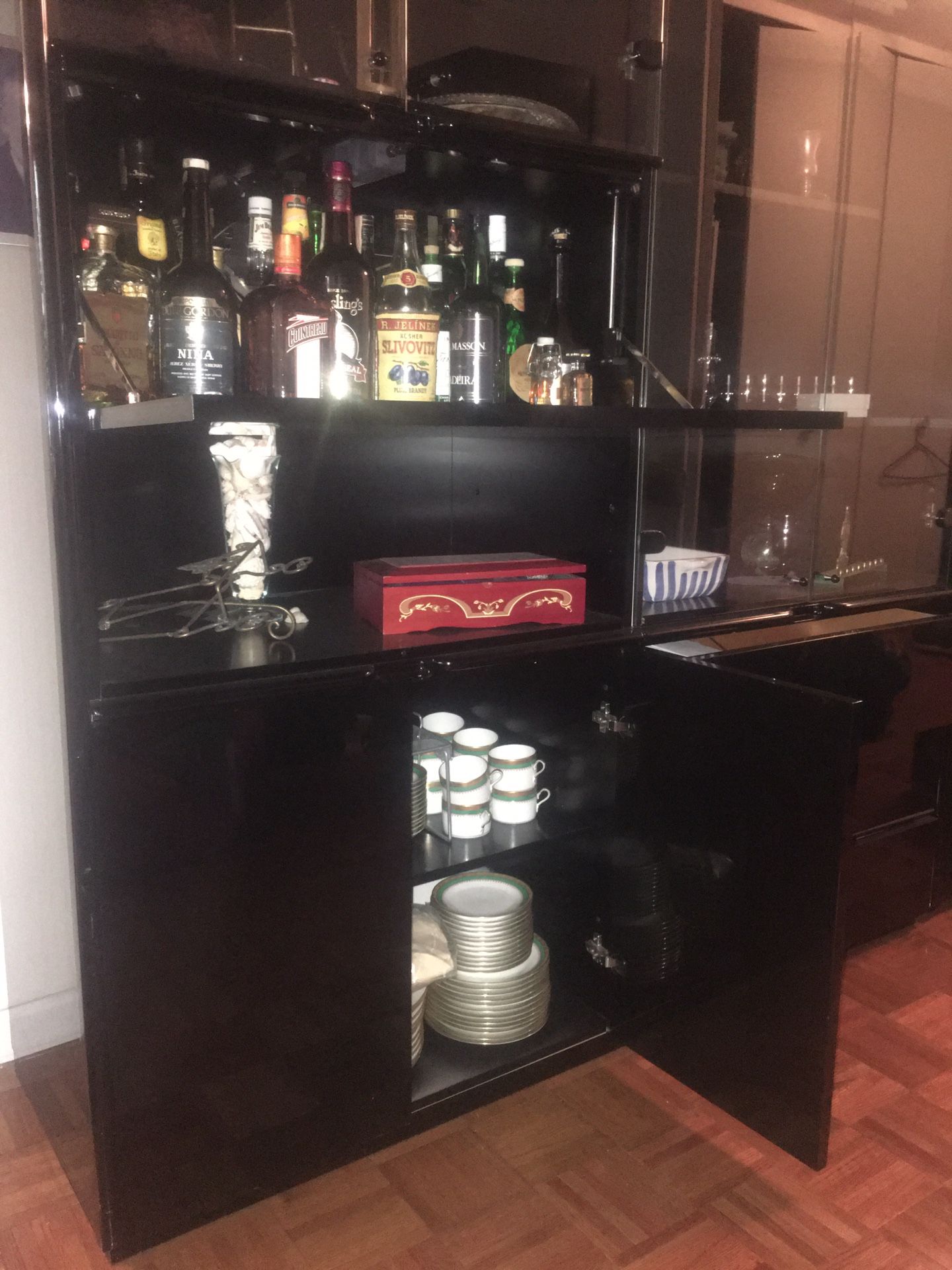 Italian made black lacquer wall unit. Lots of storage, 3 large drawers, shelves, lighting,bar. Perfect condition . 65” wide, 20” deep, 79” tall