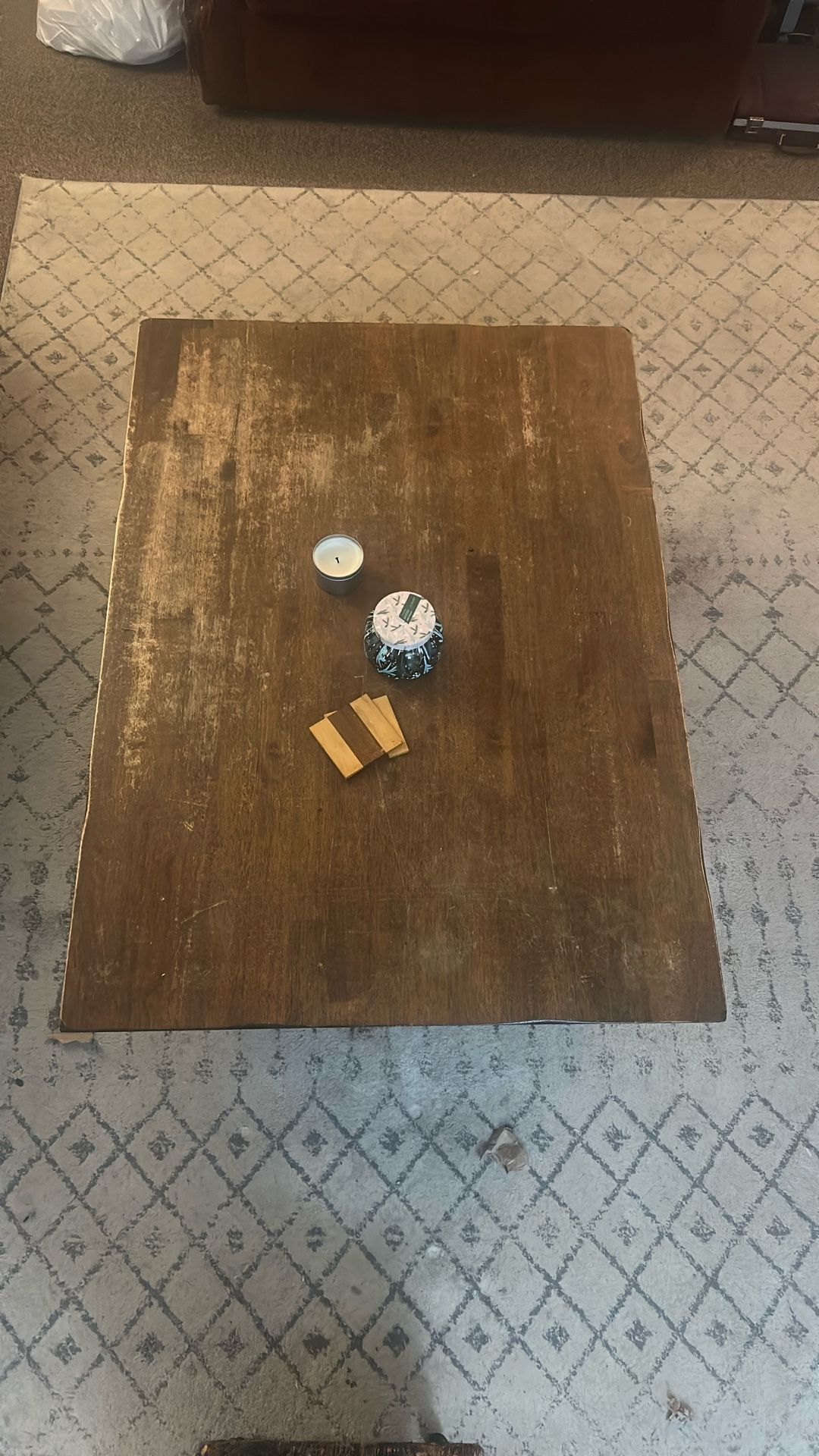 Originally from World Market. Must be picked up. Sturdy but a couple screws could use a little tightening. Storage shelf underneath. Length 49”, Depth 35”, Height 16.5”
