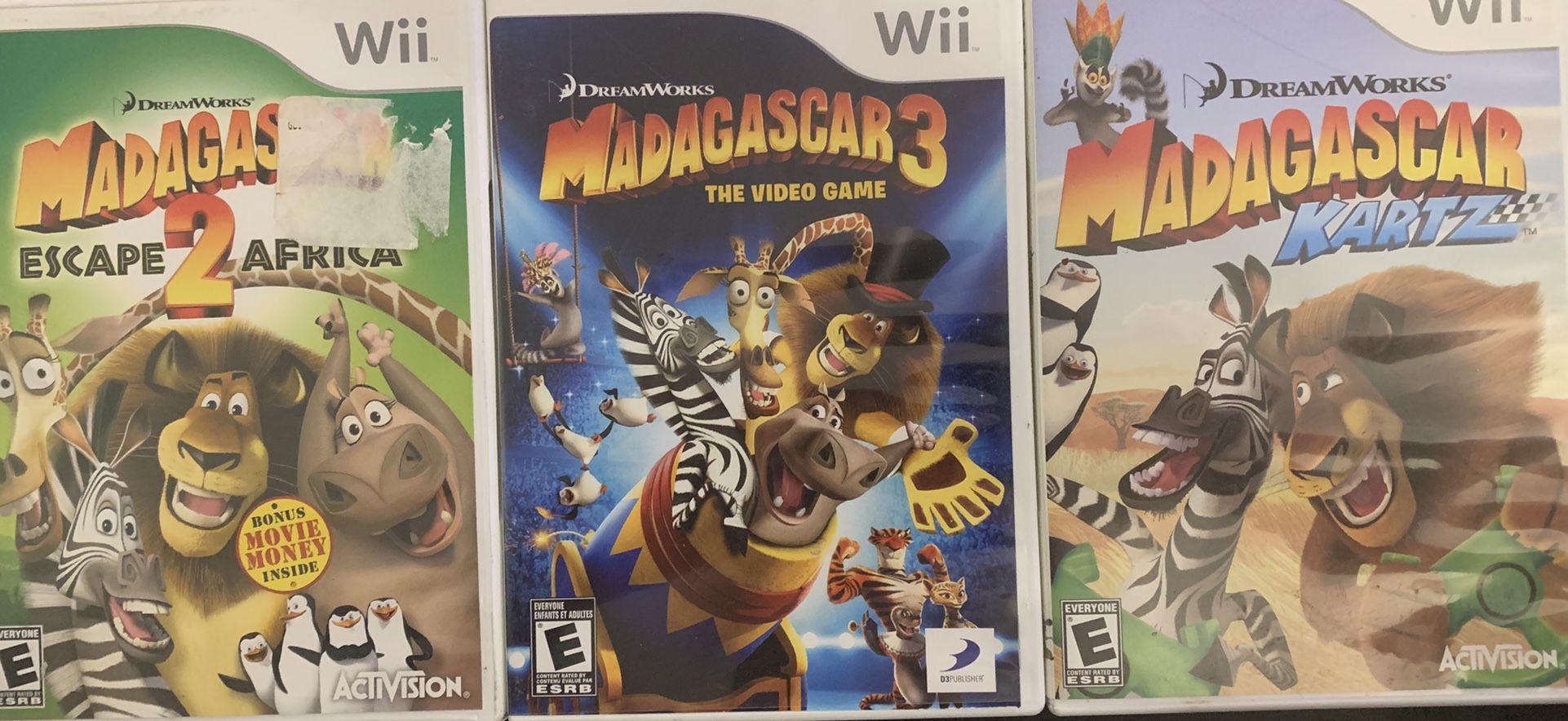 All Come In Their Original Cases! Includes The Following Games: ** MADAGASCAR 2: ESCAPE 2 AFRICA! ** MADAGASCAR 3 The Video Game! ** MADAGASCAR Kartz! All Discs Have Each Been Cleaned And TESTED!