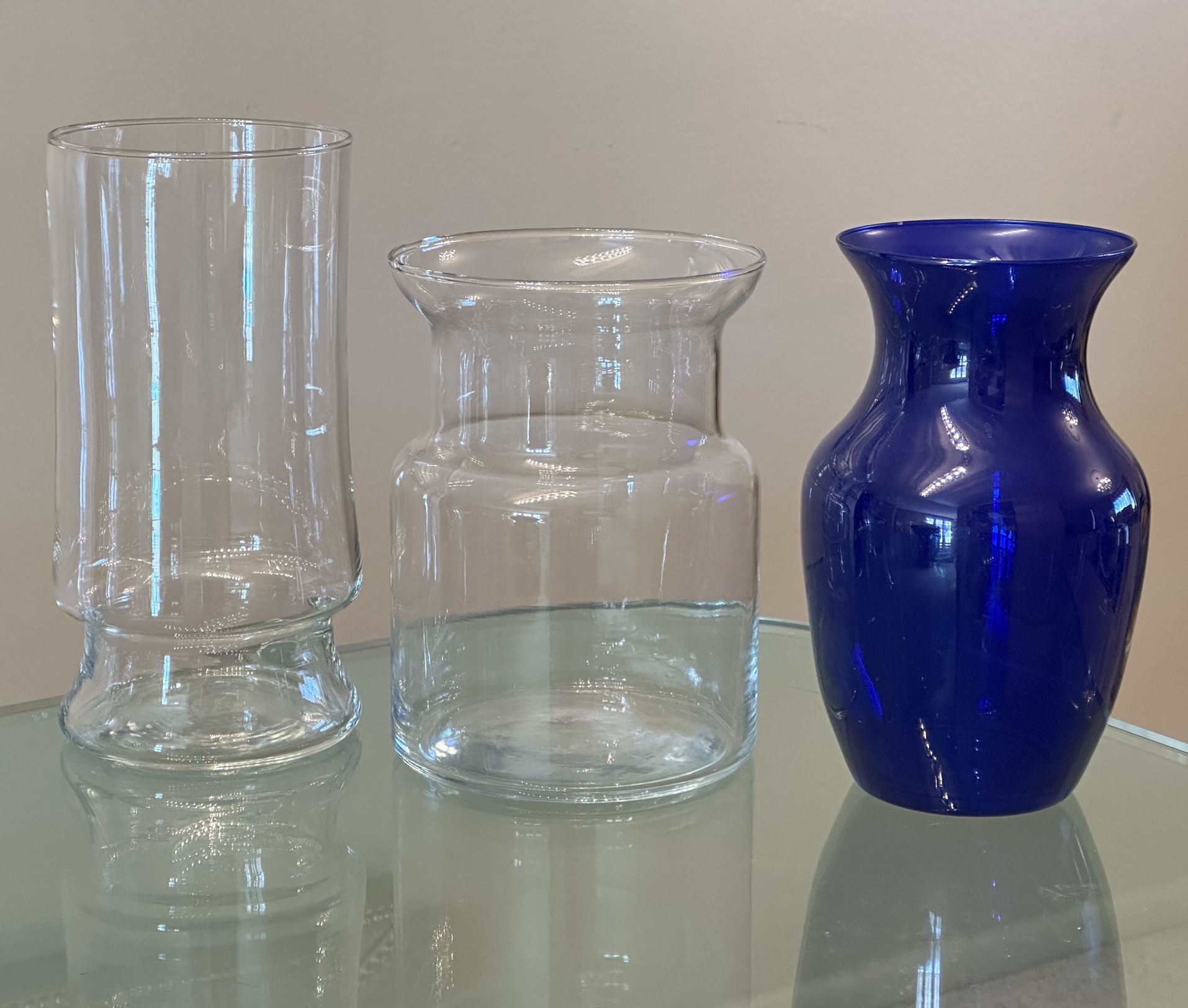 If you see this ad, then item is available, messages just asking if item is available would be ignored. 3 Glass Flower Vases. 2 clear vases and one blue vase. One the clear glass vases is 7 1/2 inches tall and 5 1/2 inches wide, the other clear glass vase is 4 1/2 inches in diameter and 9 inches tall . The blue glass vase is 8 inches tall and 5 inches wide selling all together only and pick up in Tempe.