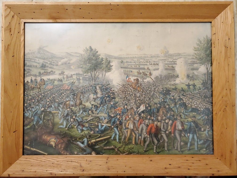 Own a literal museum piece! This is a 19th Century chromolithograph from Kurz & Allison depicting Pickett's Charge during the Battle of Gettysburg. The history behind this piece is described on the Wikipedia page for Kurz & Allison under the Civil War print series (OfferUp doesn't allow me to include external links). ¶ The original, much larger print was produced in 1884 and based on the Gettysburg Cyclorama. Kurz & Allison then made these smaller consumer prints in the following years. This copy came into my family's possession in the early 20th Century. My great-grandfather restored a damaged corner and put the print in its current wormwood frame at his shop in Wenatchee in the 1950's. This is one of the original, 19th Century chromolithographs directly from Kurz & Allison themselves, NOT one of the smaller 1960's commemorative reprints marking the centennial of the Civil War you typically see for sale today. You can also read more about this museum piece on the Saint Louis University Museums website under Exhibitions > Virtual Exhibitions > Civil War: Imagined and Real. ¶ The Battle of Gettysburg was Kurz & Allison's very first chromolithograph. It depicts Pickett's Charge, featuring General Armistead leading his brigade to what's commonly referred to as the high-water mark of the Confederacy, where they broke through Union lines at a bend in the wall before Armistead was shot from his horse, as seen in the middle of this print. There's a Wikipedia page for "High-water mark of the Confederacy", too! Kurz & Allison notably included Black participants in their depictions of the Civil War, which was unusual at the time. In this scene, they put a Black man front and center helping carry a wounded Confederate soldier among a group of captured POWs. ¶ I tried showing notable aspects of the chromolithograph as well as damage in my attached photos here. It appears the print was rolled up or folded at some point, creating lines and creases, and there are a couple tears at the edges. Colors are still surprisingly vibrant, though the glass used in this frame is a bit reflective and slightly frosty, which made taking clear pictures difficult. Given the condition, I'm only asking $175. This is not only a piece of American history, chromolithographs were cutting-edge at the time and a technological step forward in color printing, so this is a piece of scientific and artistic history as well. Get in touch if you want it to be yours!