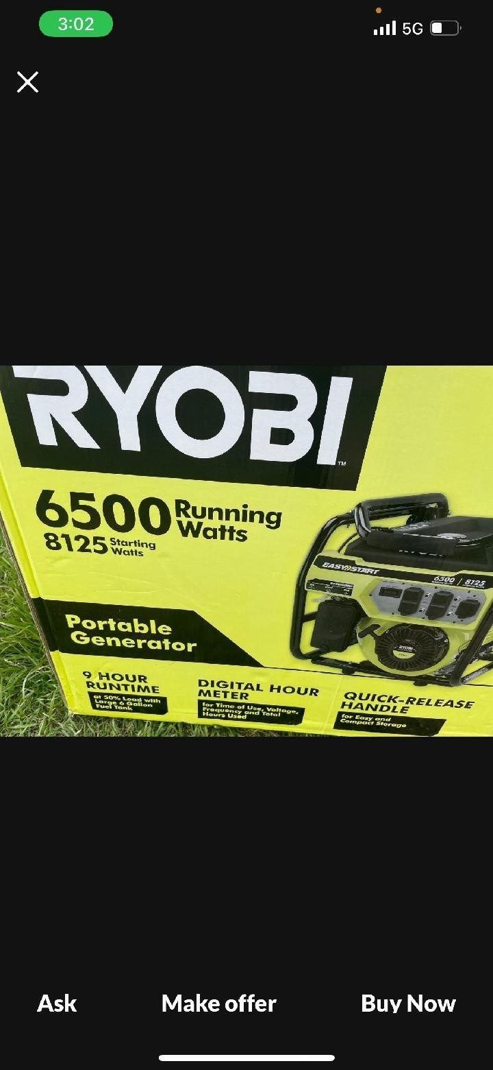 New 6500 Ryobi this is a powerful ass Generator. perfect for work. New in box i started it 1 time it still new . cost over 1100.00. Im sell it for the first 500.00...