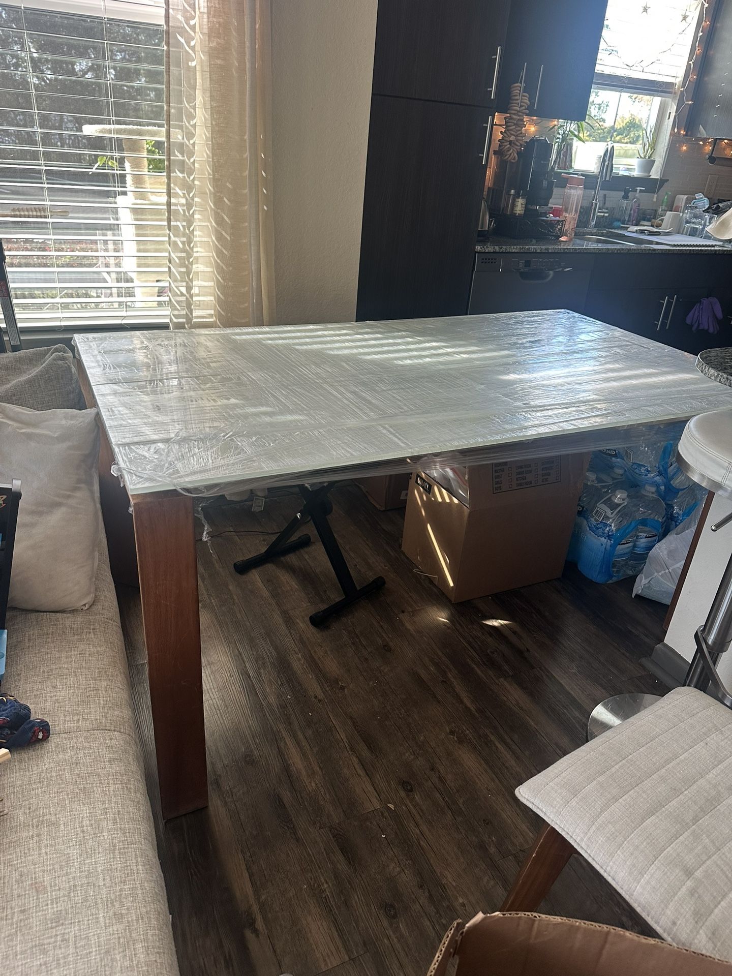 Expandable dining table with a white frosted glass top. Table only. Glass is in good condition with no cracks or chips. Wood legs have minor cosmetic wear from normal use and can be easily re-stained. No structural damage. Sits 6-10 people comfortably. Selling because it’s too large for our new apartment. First-floor pickup.