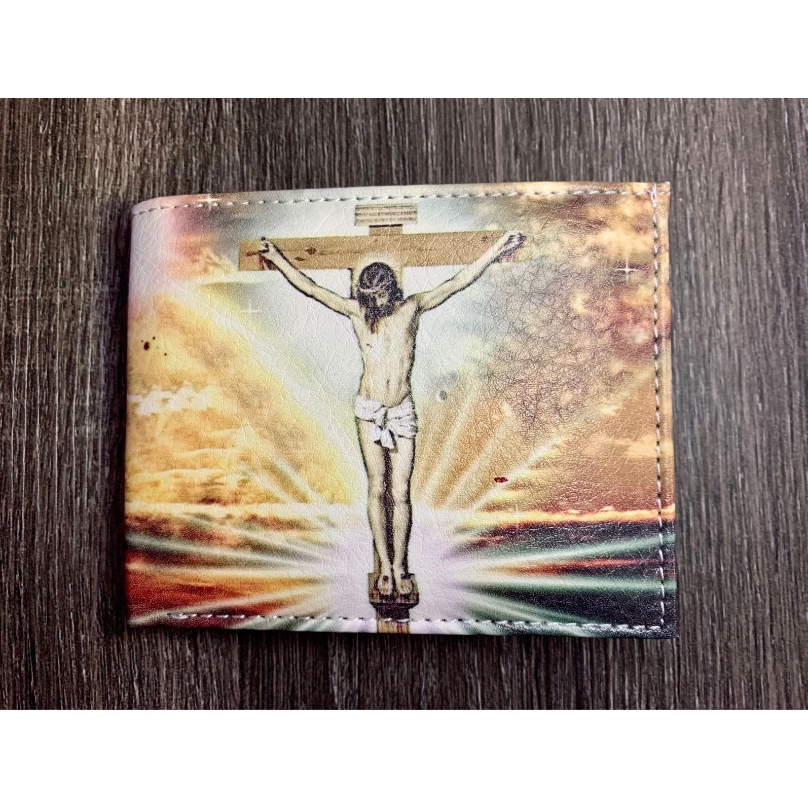 This is a genuine leather, handmade wallet of Jesus on the cross.