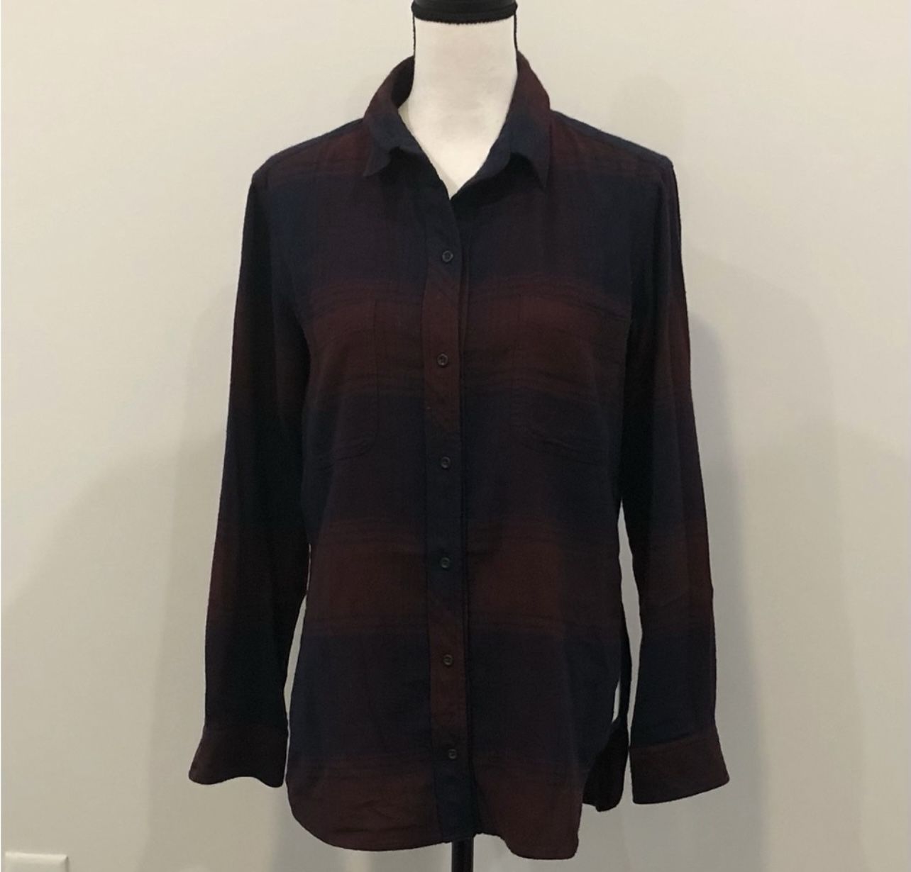 Athleta plaid flannel shirt. Navy and burgundy. Full button. Left chest pocket. Long sleeve wit button cuffs. Super soft. High-low style. Size S. Linen 15z