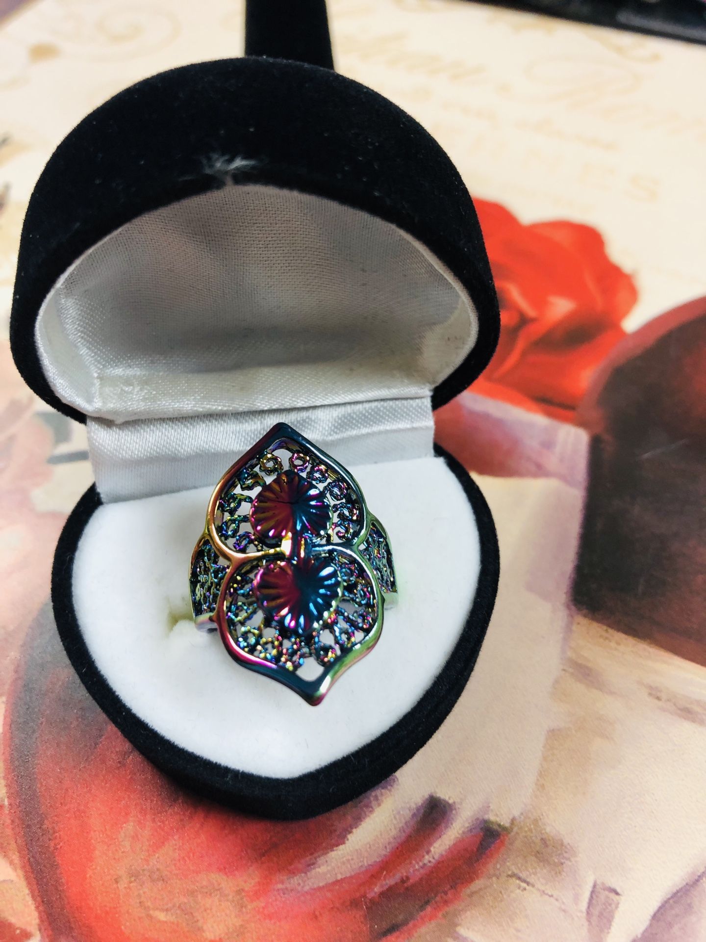 This is a uniquely designed ring. It is plated with 18Kt rainbow gold. Something new and innovative that’s quickly gaining popularity. No two rings like this are the same. This one is size