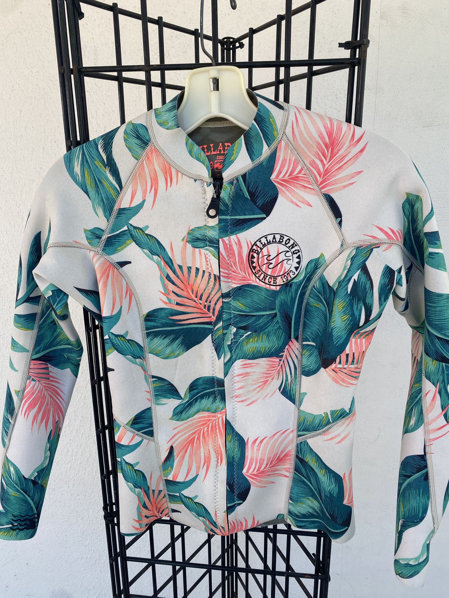 Billabong women’s Surf Capsule wetsuit jacket long sleeve in tropical leaf print. Size 6, front zip. 80% nylon, 20% spandex. Great condition!