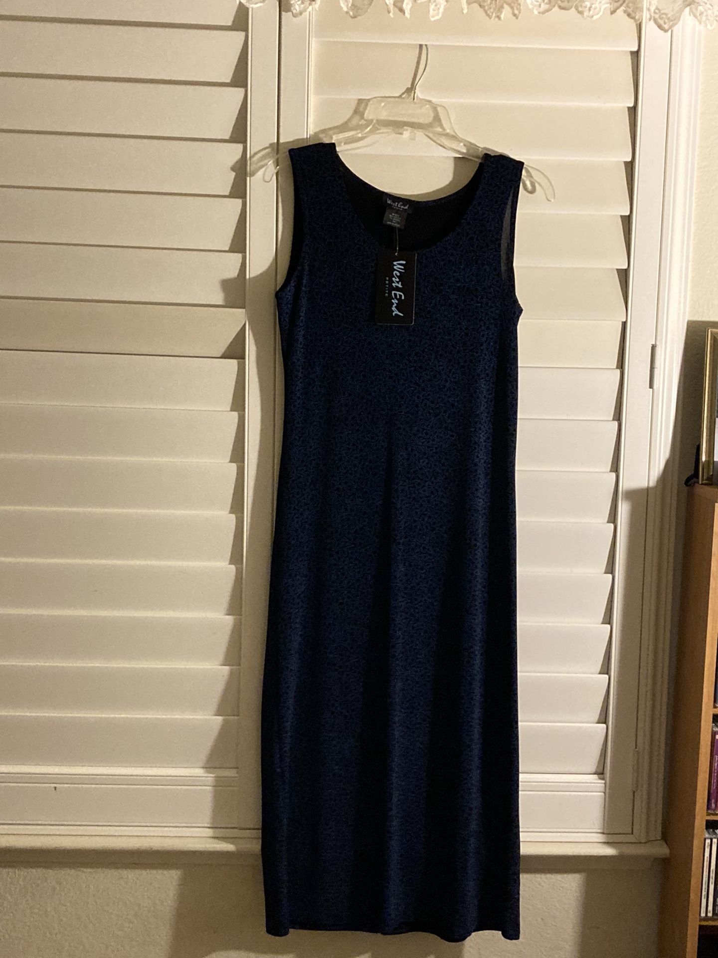 Sleeveless, Black/blue print., a slit on the back..By West End 96% Acetate, 4% Spandex, PS